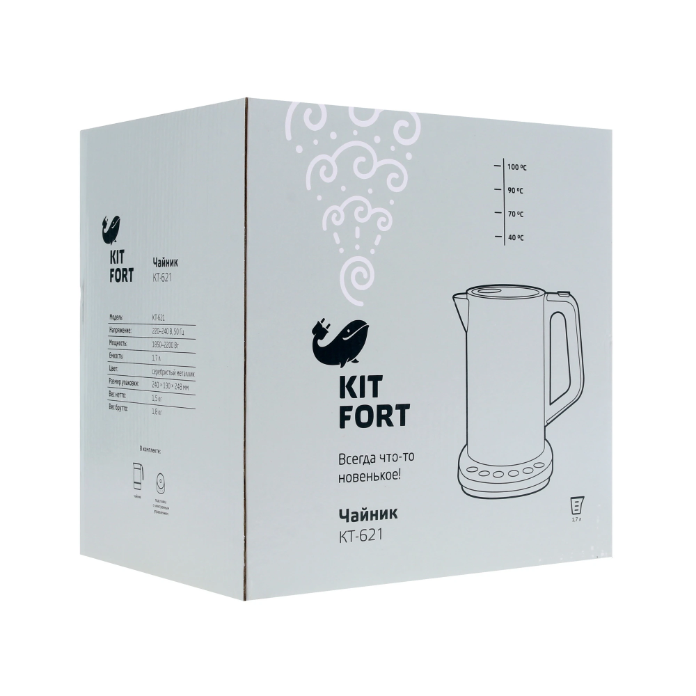 Электрочайник Kitfort КТ-621 позволяет выбрать температуру воды. Предоставляется несколько режимов для владельцев. Создана удобная панель управления, с ее помощью удается выставлять параметры.
