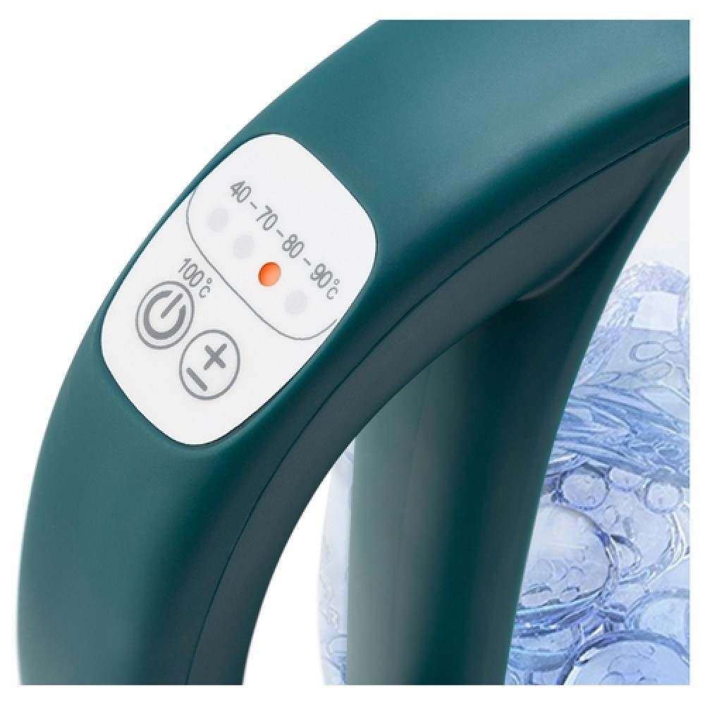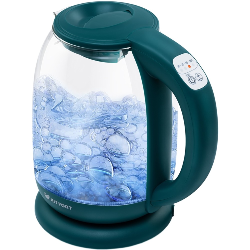 Электрочайник Kitfort KT-640-4 представлен в зеленом пластиковом корпусе с резервуаром из термостойкого стекла на 1.7 л, дополненным удобной шкалой. Скрытая конструкция нагревателя упрощает очистку емкости от накипи. Устройство дополнено функциями поддержания температуры и нагрева до определенного уровня в пределах 40-100 градусов.