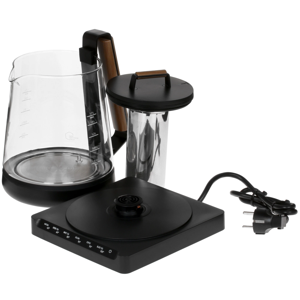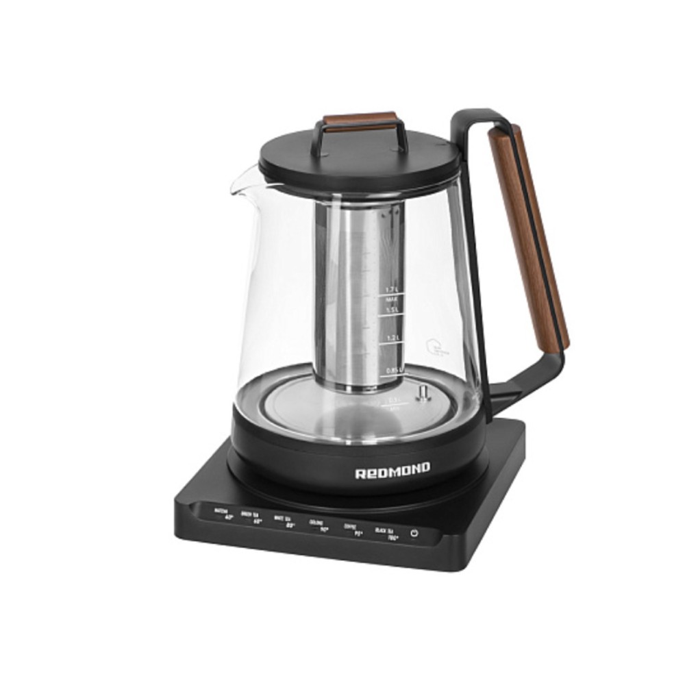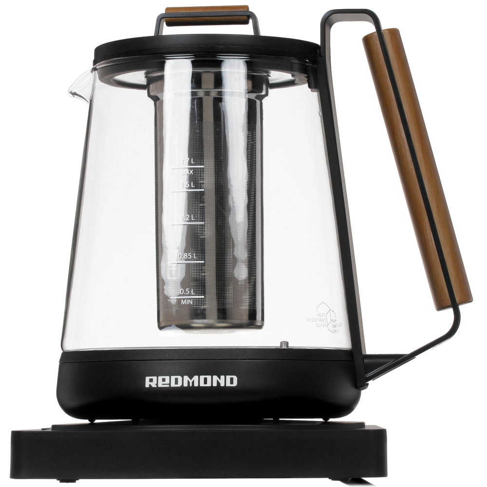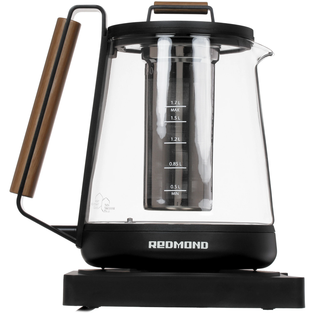 Электрочайник Redmond RK-G1308D с необычным дизайном черного корпуса и прозрачной емкости на 1.7 л со шкалой дополнен внутренним заварником. Это позволяет насладиться натуральным чаем без мешающих в кружке листиков или гранул. Устройство свободно крутится на подставке, дополняется маленьким носиком без фильтра, съемной крышкой и длинной боковой ручкой.