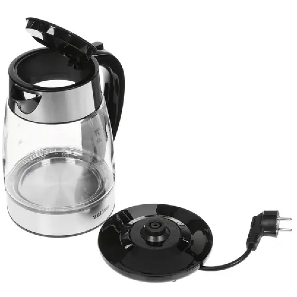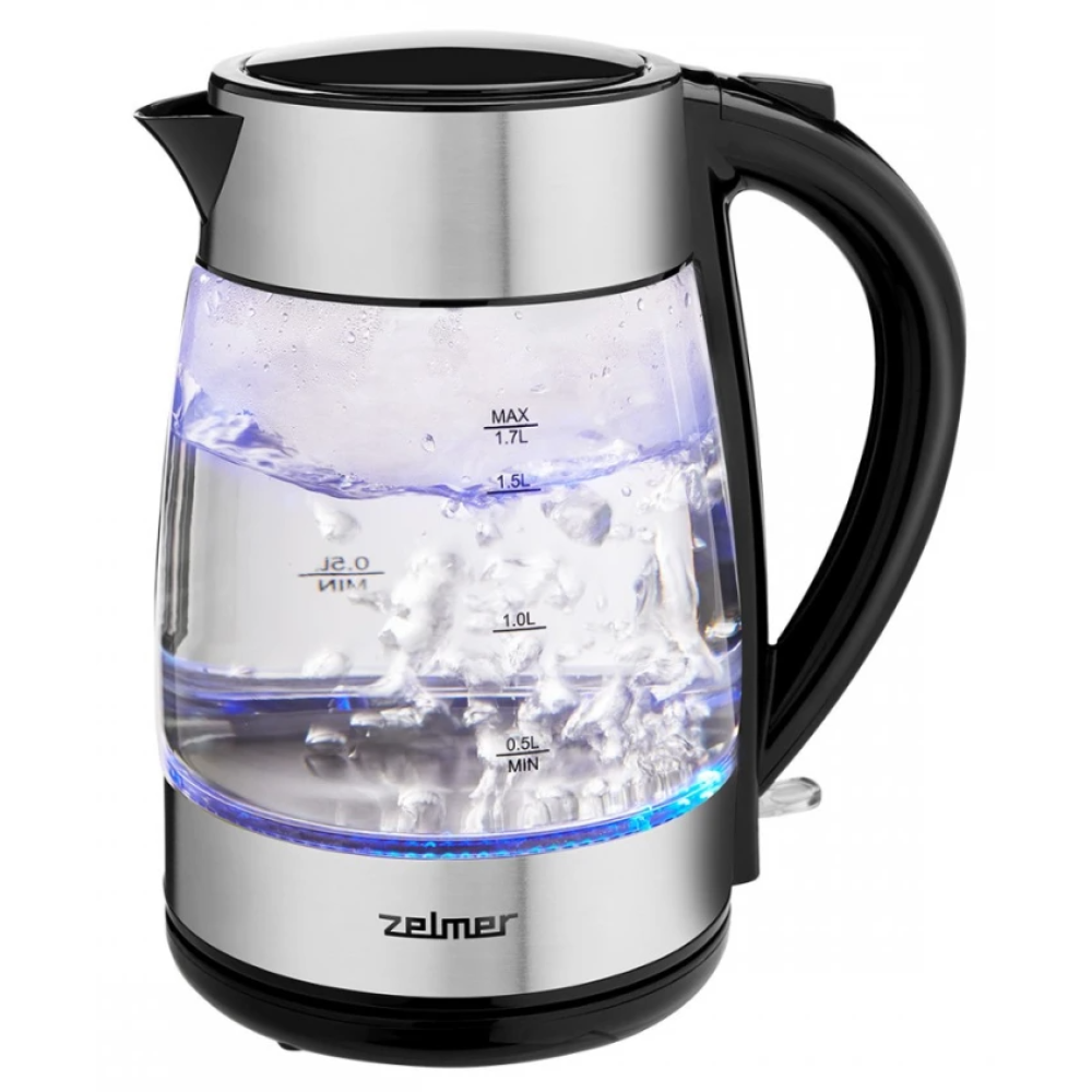 Благодаря синей подсветке прибора Zelmer ZCK8011 издалека видно, что вода в чайнике еще кипятится. Устройство само отключится при закипании, но не включится без воды. Чайник свободно крутится на подставке и дополняется яркой рабочей индикацией.