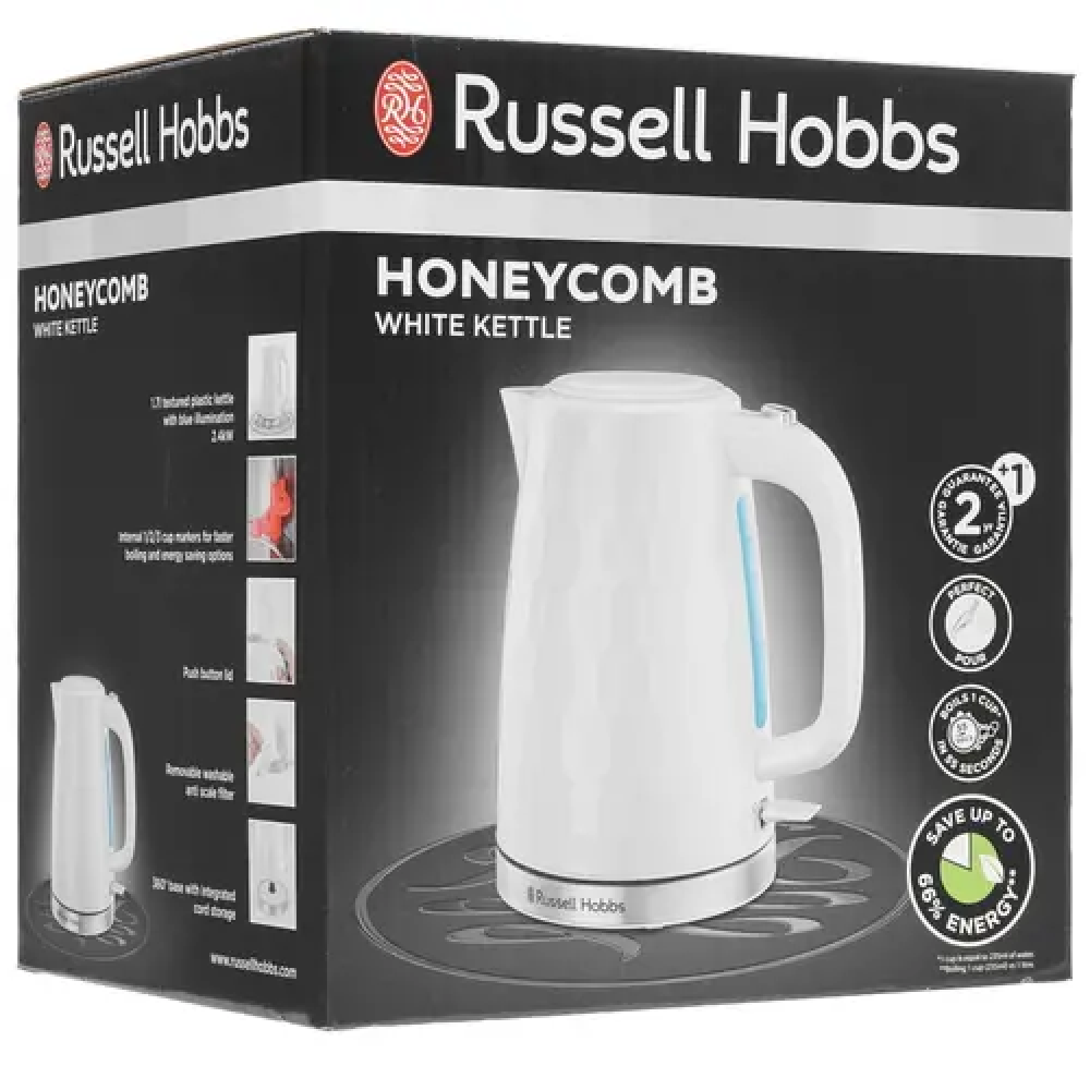 Электрочайник Russell Hobbs Honeycomb 26050-70 располагает технологией автоматического отключения, которая срабатывает после того, как домашний помощник завершит процесс подогрева воды. Отличительная особенность прибора заключается в тщательно продуманной форме носика, благодаря которой ни одна капля жидкости не окажется на кухонной поверхности. Откидная крышка способствует значительному упрощению доступа к основному 1.7-литровому резервуару, к примеру, для его очистки от загрязнений.