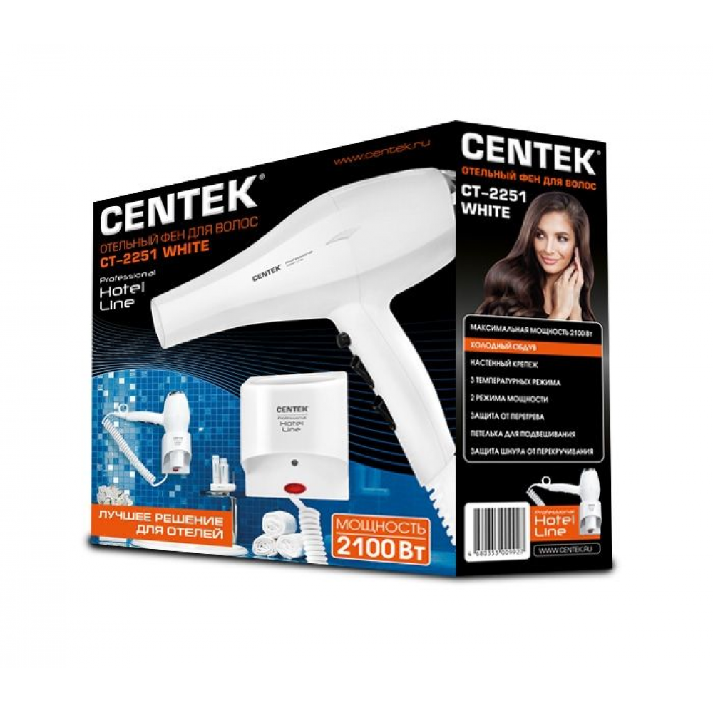 Centek CT-2251 White — настенный фен с турмалиновой ионизацией, холодным обдувом и мощностью 2100 Вт. Идеален для гостиниц, бассейнов и медцентров. Оснащён защитой от перегрева, съёмным фильтром и петлёй для подвешивания. Спиральный шнур длиной 2.4 м обеспечивает удобство в использовании.