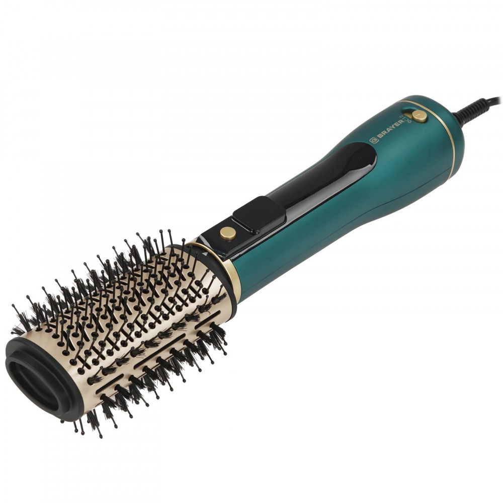Фен-щётка Brayer BR3136 — универсальный прибор для сушки и укладки волос с мощностью 1200 Вт. Имеет две скорости воздушного потока и два температурных режима, а также режим подачи холодного воздуха — что помогает фиксировать укладку. В комплект входят три насадки: овальная щётка (41-61 мм) для придания объёма и лёгких волн, концентратор для направленной сушки и расчёска-насадка для выпрямления волос. Кабель длиной 1.8 м оснащён вращением, есть петелька для подвешивания. Устройство покрыто защитой от перегрева.