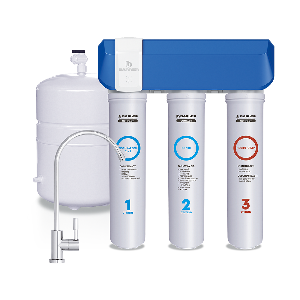БАРЬЕР Compact OSMO 100 — первый трёхступенчатый обратный осмос , который по эффективности не уступает пятиступенчатому. В результате вы получаете кристально чистую воду, которая не уступает по качеству бутилированной. Система обратного осмоса — оптимальное решение не только для питья, но и для бытовой техники. Чайник, кофе-машина, утюг, увлажнитель будут работать дольше.