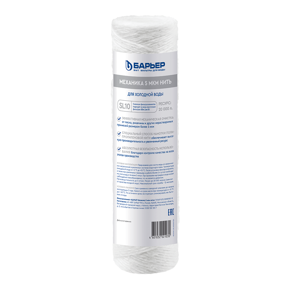 Картридж БАРЬЕР «Механика 5 мкм нить» задерживает механические примеси до 5 мкм (песок, ржавчину и др.). Картридж совместим с любым фильтром из семейства ПРОФИ и ПРОФИ ИН-ЛАЙН. Как правило, используется в качестве первой ступени. Также совместим с системами других производителей стандарта SL10.