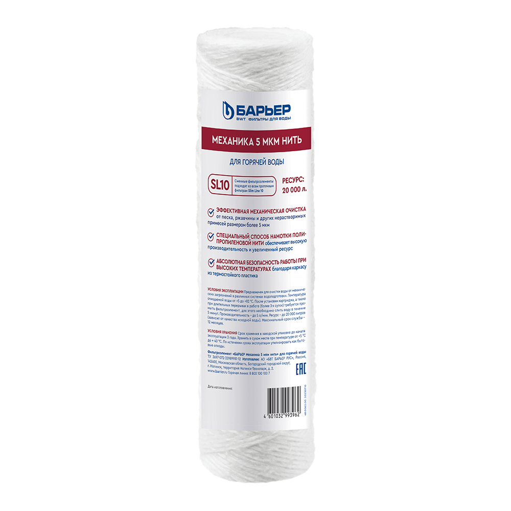 Картридж БАРЬЕР «Механика 5 мкм нить» задерживает механические примеси до 5 мкм (песок, ржавчину и др.). Картридж совместим с любым фильтром из семейства ПРОФИ и ПРОФИ ИН-ЛАЙН. Как правило, используется в качестве первой ступени. Совместим с системами других производителей стандарта SL10.