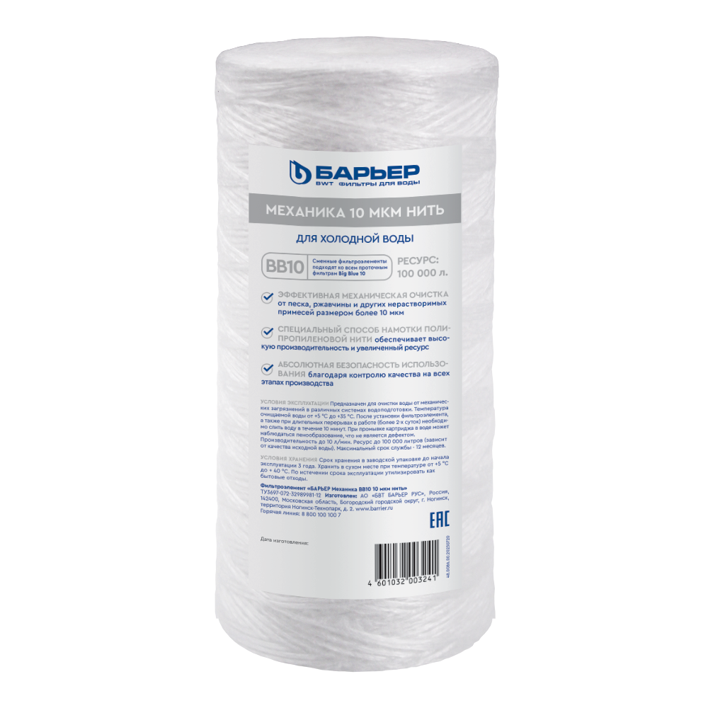 Картридж БАРЬЕР «Механика 10 мкм нить» задерживает механические примеси размером до 10 мкм (песок, ржавчину и другие механические примеси).