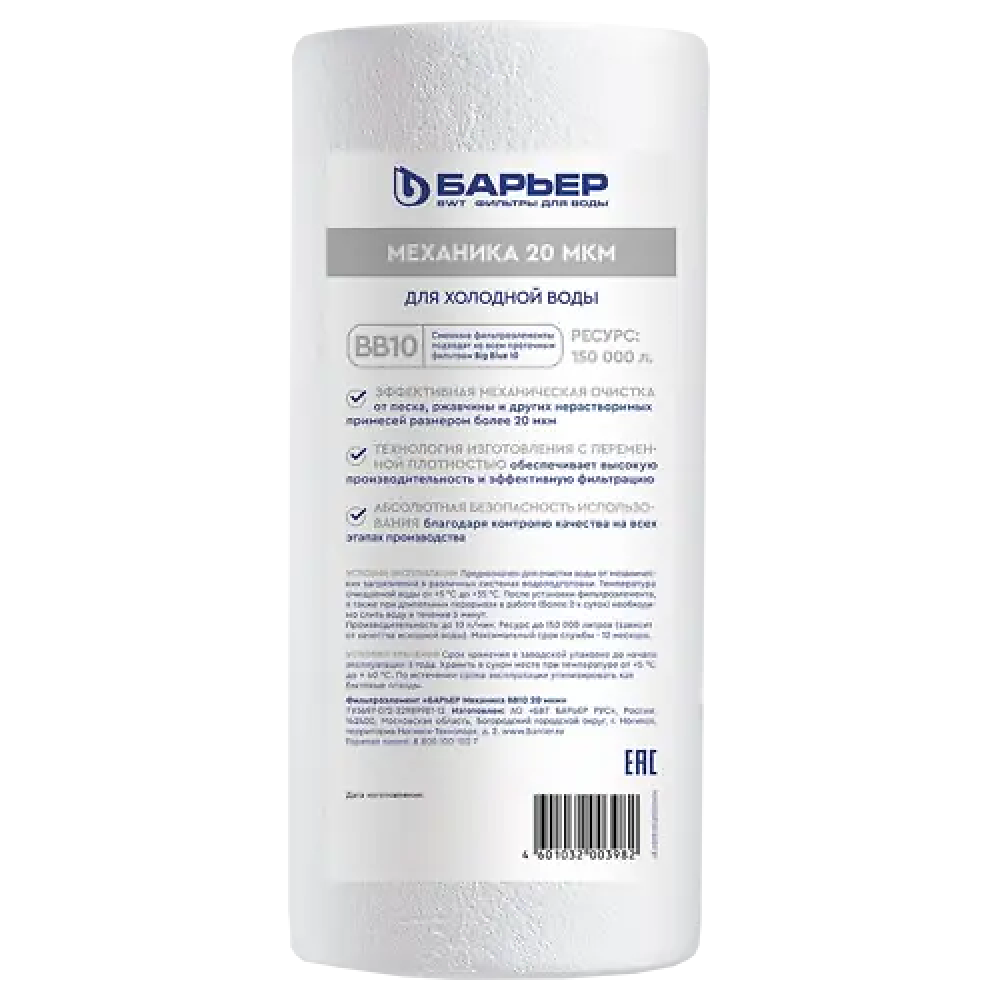 Картридж БАРЬЕР «Механика» задерживает механические примеси до 20 мкм (песок, ржавчину и другие механические примеси). Картридж совместим с любыми системами стандарта Big Blue"10.