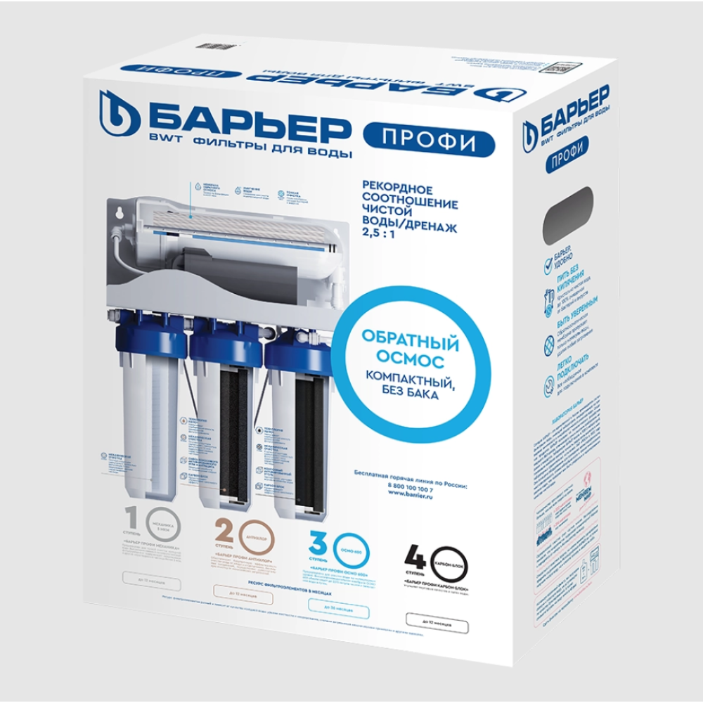 4 ступень — БАРЬЕР ПРОФИ Карбон-Блок. Благодаря качественному активированному углю удаляет хлор, органические соединения, фенол и другие вредные вещества.