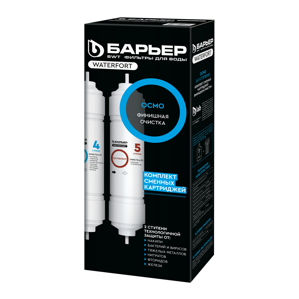 4 ступень — БАРЬЕР WaterFort Осмо. Обратноосмотическая мембрана производительностью в 100 галлон (≈ 300 литров в сутки) из тонкопленочного полиамидного композита. Очищает воду на молекулярном уровне от различных солей, хлоридов, фторидов, сульфатов, нитратов, ионов металлов, высокомолекулярных органических соединений и различных микроорганизмов, включая бактерии и вирусы. Все вредные примеси смываются в дренаж. Рекомендуемая периодичность замены — раз в 12-18 месяцев.