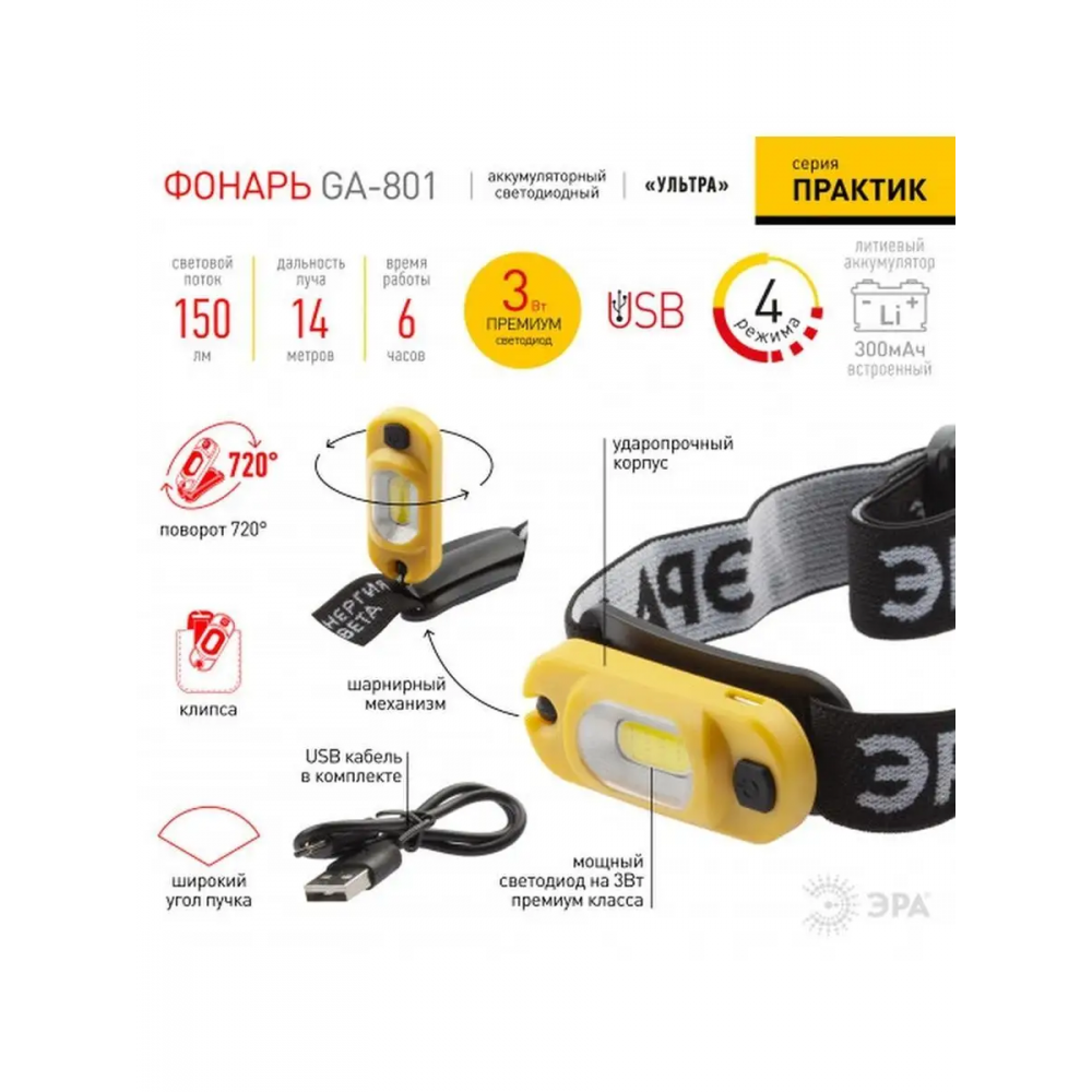 ЭРА GA-801 — компактный налобный фонарь с ярким COB+LED светом, четырьмя режимами работы и встроенным аккумулятором. Идеален для ремонтных, туристических и бытовых задач. Устойчив к влаге и ударам, удобно крепится на голову благодаря регулируемому ремню.