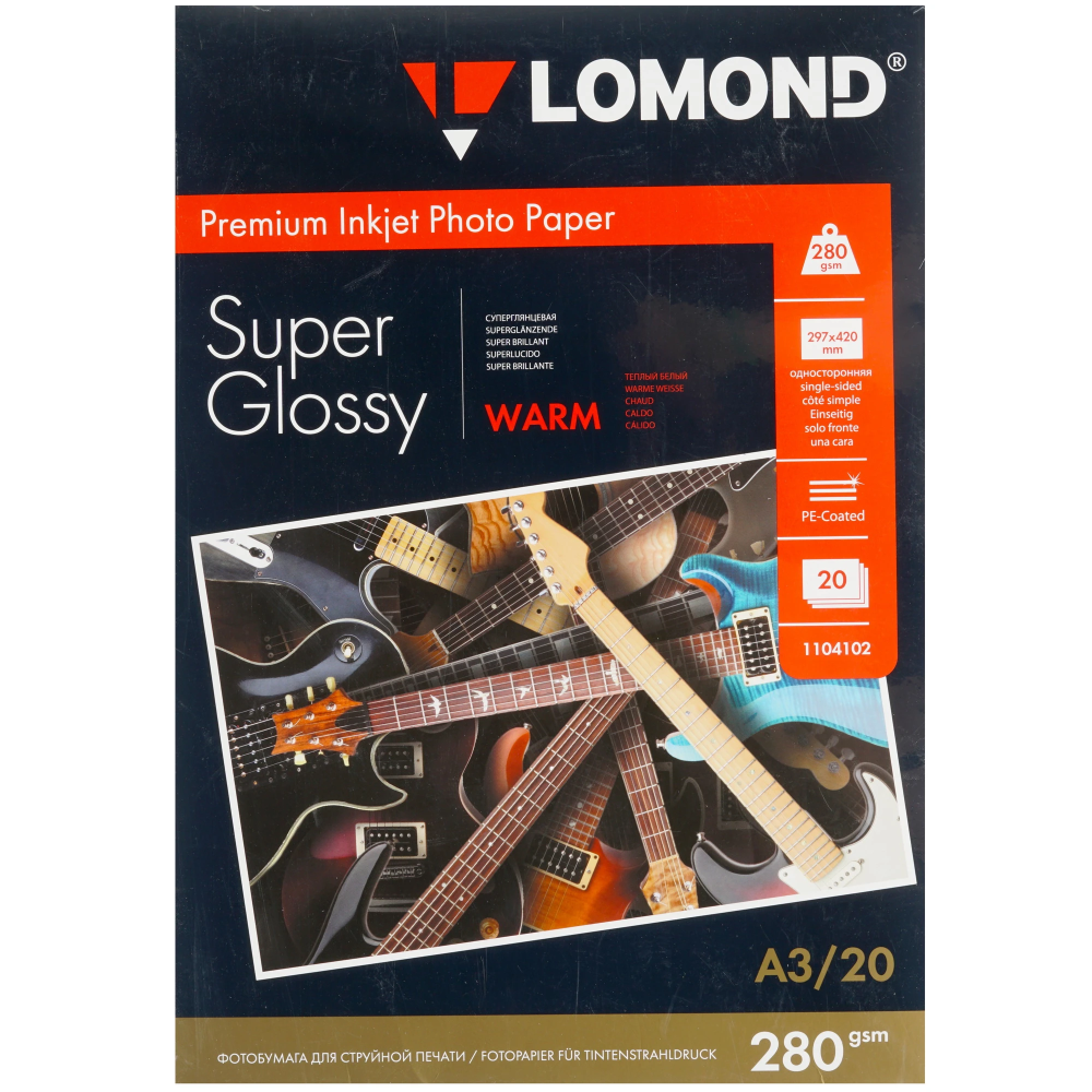Фотобумага Lomond 1104102 имеет размер 297x420 мм, что соответствует формату А3. Плотность достигает 280 г/м², что также как и материал покрытия обеспечивает устойчивость к деформации и исключает риск просачивания чернил на оборотную сторону. Набор фотобумаги Lomond 1104102 содержит 20 листов.