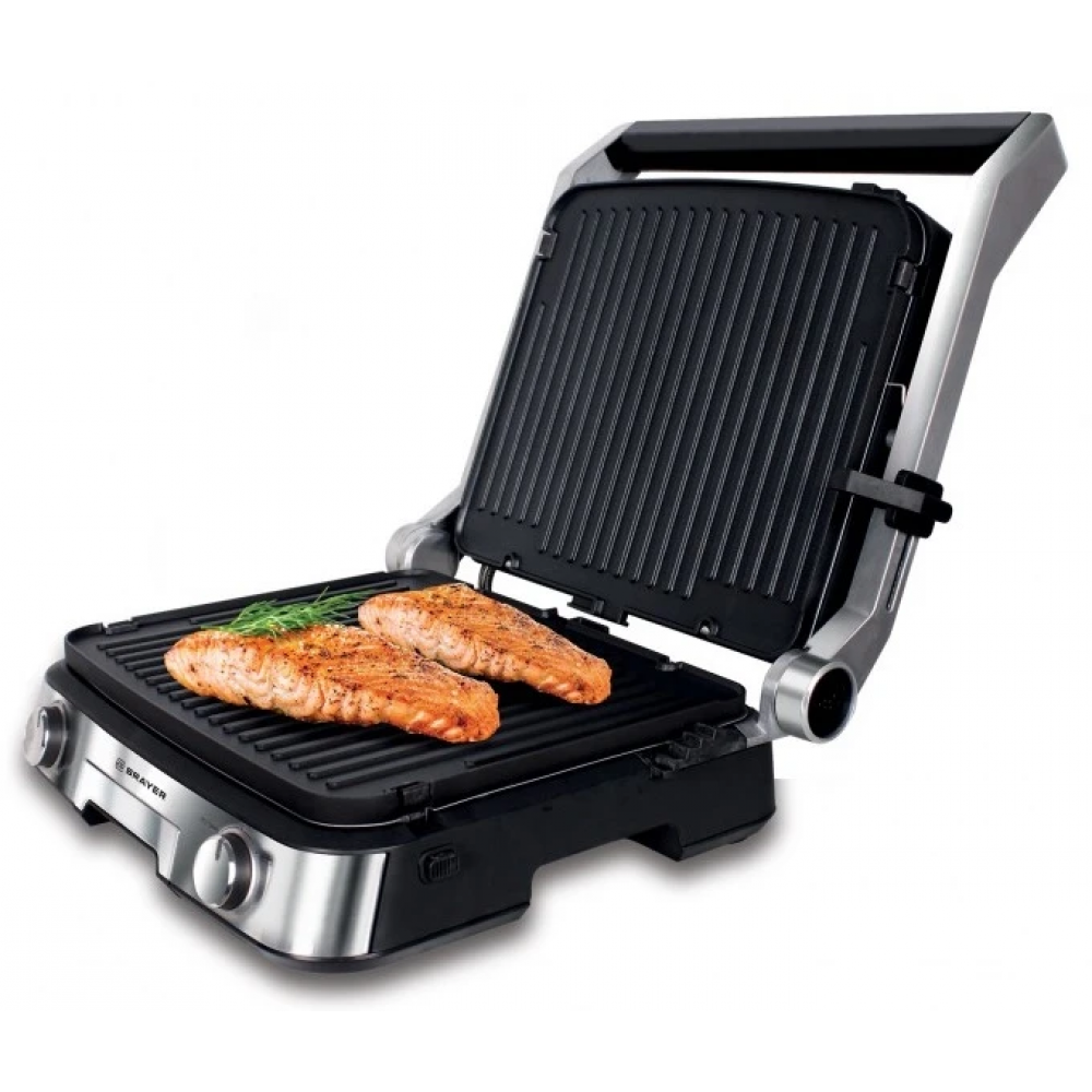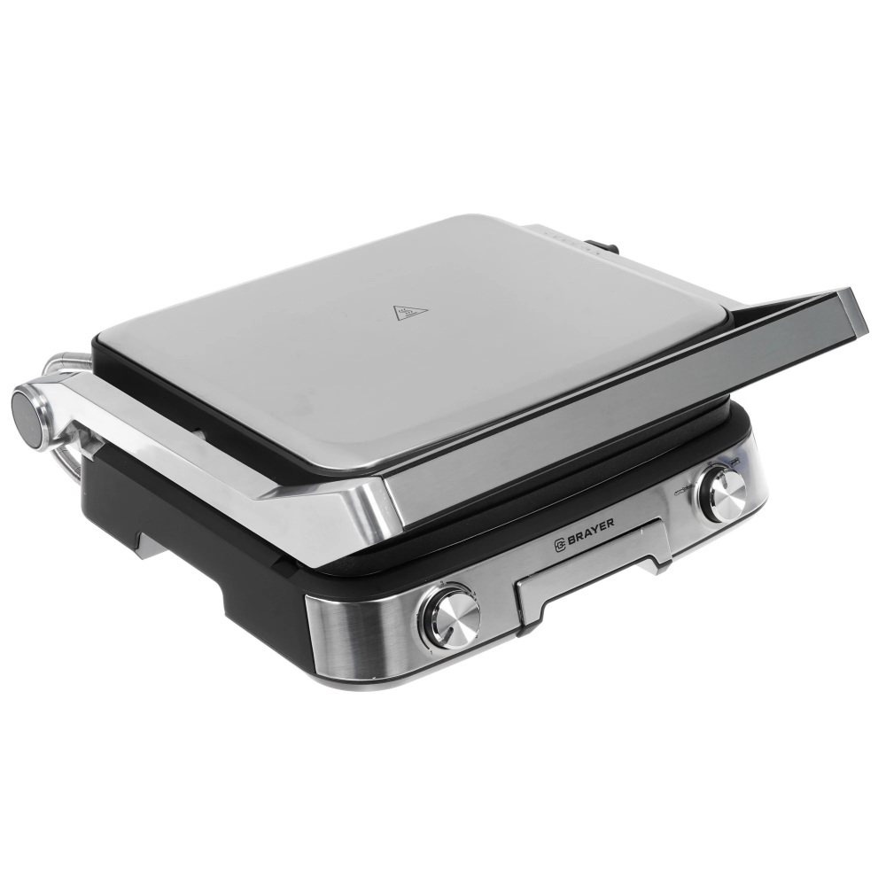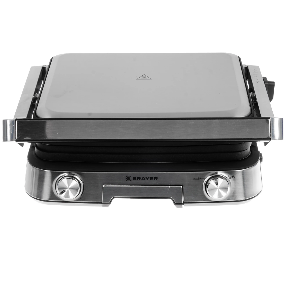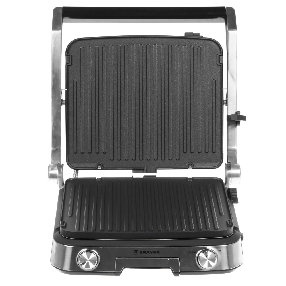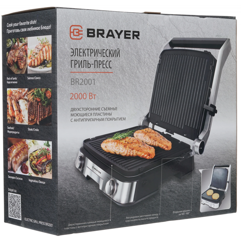 Верхняя крышка открывается до 180 градусов, что предусматривает возможность поджаривания в режиме барбекю. Управление мощностью нагрева и режимами выполняется с помощью поворотных переключателей. Среди других особенностей гриля Brayer 2001BR отмечаются поддон для сбора жира и индикатор питания.
