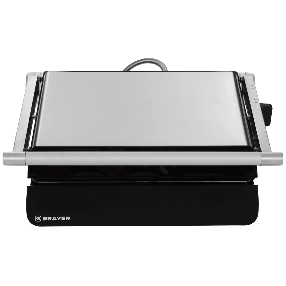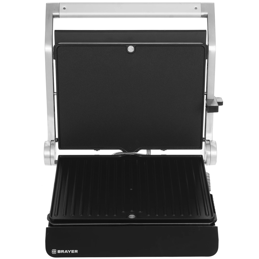 Brayer BR2008 имеет антипригарное покрытие, которое исключает необходимость в добавлении масла. Доступ к функционалу открывается через сенсорные переключатели. Прижимная пластина служит для регулировки давления верхней пластины и приготовления продуктов различной толщины. Съемный механизм облегчает очистку панелей от загрязнений.