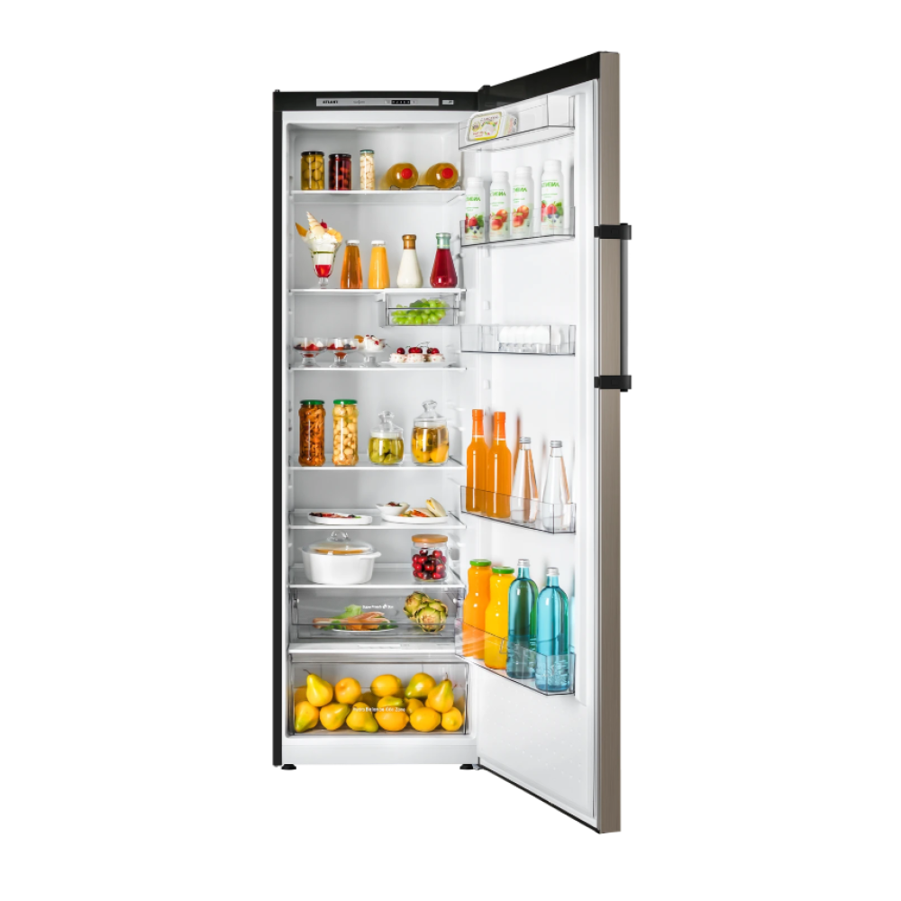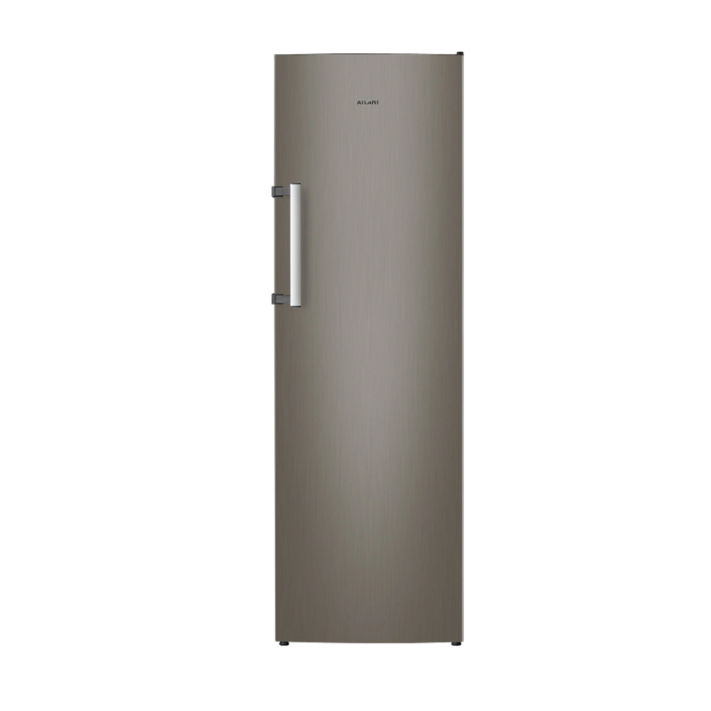 Холодильник выполнен в сером цветовом исполнении с наружной вертикальной ручкой-скобой серебристого цвета, которая подчеркивает эксклюзивный дизайн модели. В камере расположено 5 полок из закаленного стекла. На двери холодильника установлено 5 емкостей из ударопрочного пластика, в том числе емкость нижняя с ограничителем для бутылок и емкость верхняя с крышкой.