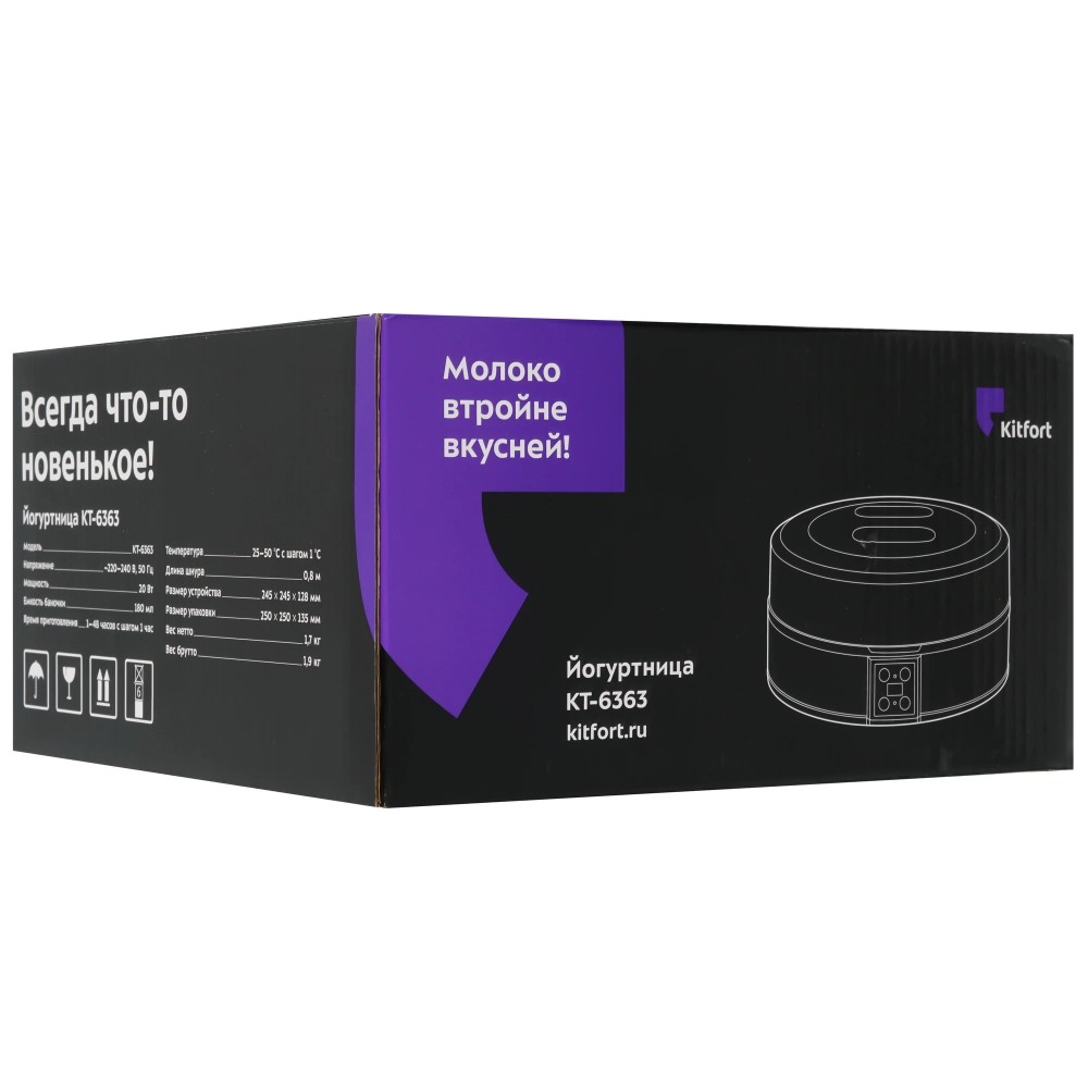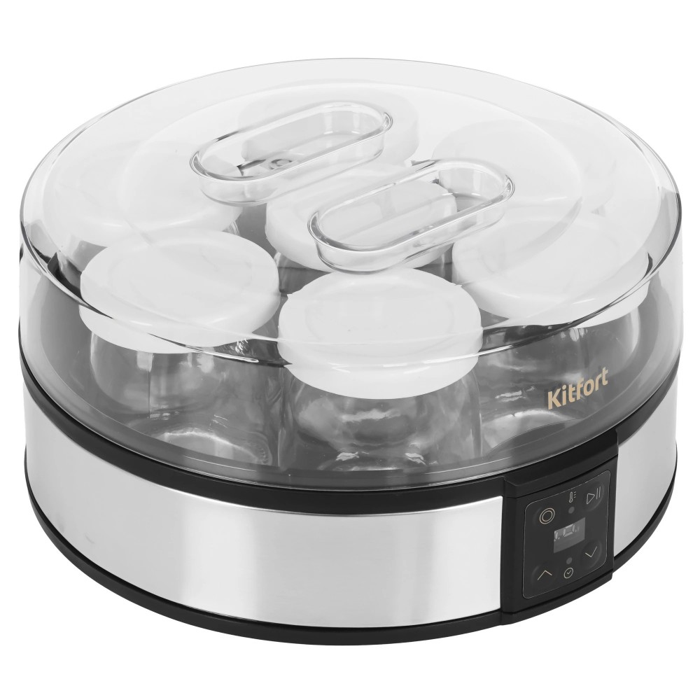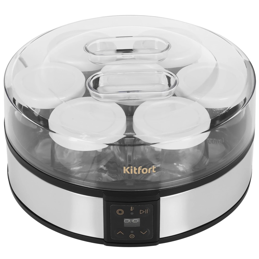 Йогуртница Kitfort КТ-6363 оснащена электронной панелью управления. Таймер предусматривает программирование времени работы до 48 часов. Температура нагрева настраивается в диапазоне 25-50°С. Благодаря разборной конструкции прибор прост в уходе.