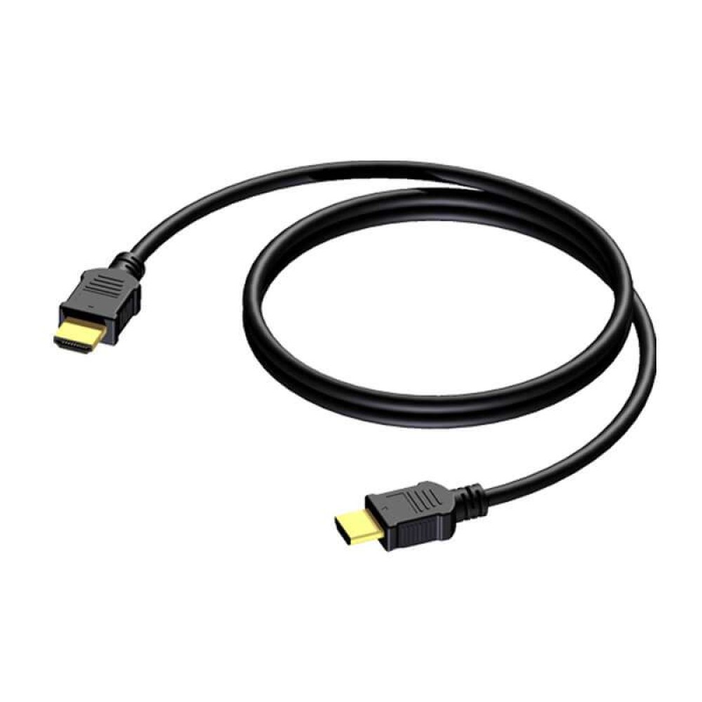 Кабель HDMI, позолоченные контакты с бескислородными медными жилами и тройное экранирование, сечение проводника 30 AWG. Кабель поддерживает Ethernet и обратный аудиоканал. Длина 0,5 метра. Производитель: PROCAB (Бельгия).
