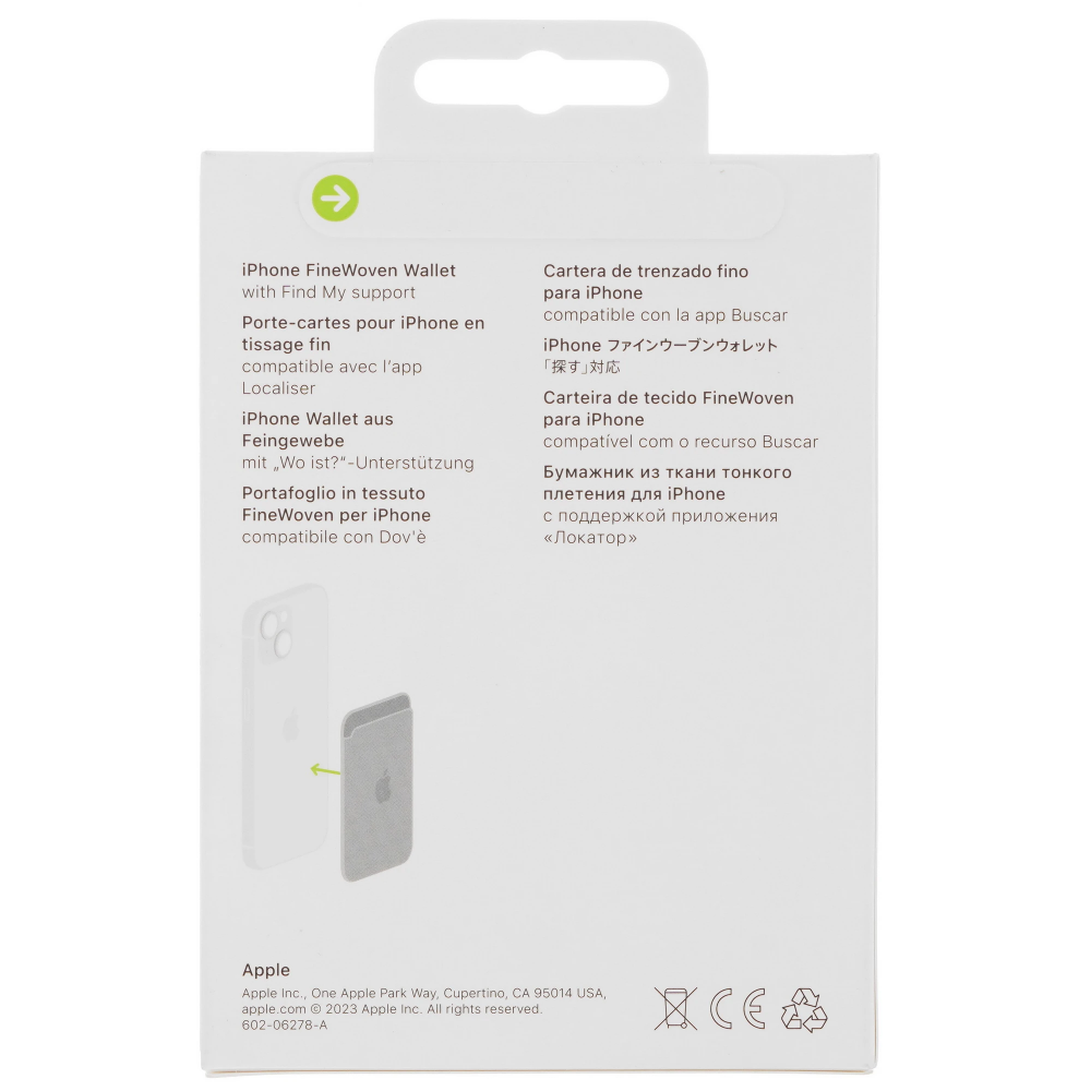 Магнитный кардхолдер из материала FineWoven — экологичного микротвилла, изготовленного из переработанного сырья. Надёжно крепится к iPhone через MagSafe, поддерживает функцию Find My для отслеживания последнего местоположения. Вмещает до 3 карт, экранирован для защиты банковских данных. Совместим с iPhone 12–15 всех моделей, включая Pro и Plus, а также с чехлами MagSafe.