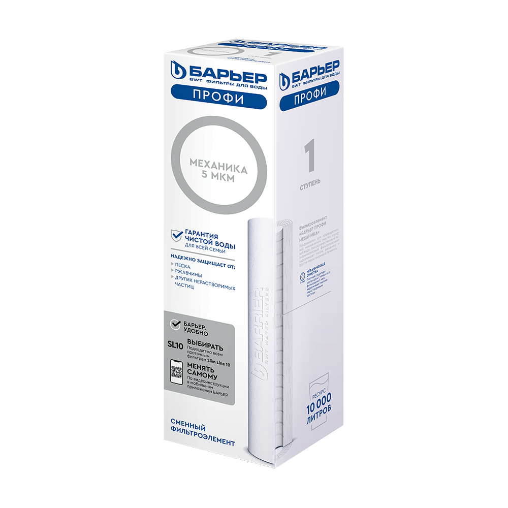 Сменный картридж для проточного фильтра БАРЬЕР стандарта Slim Line 10 (SL10). Удаляет любые механические примеси более 5 мкм — песок, пластик, ржавчину и др. Производительность — 2 л/мин, ресурс — 10 000 литров.