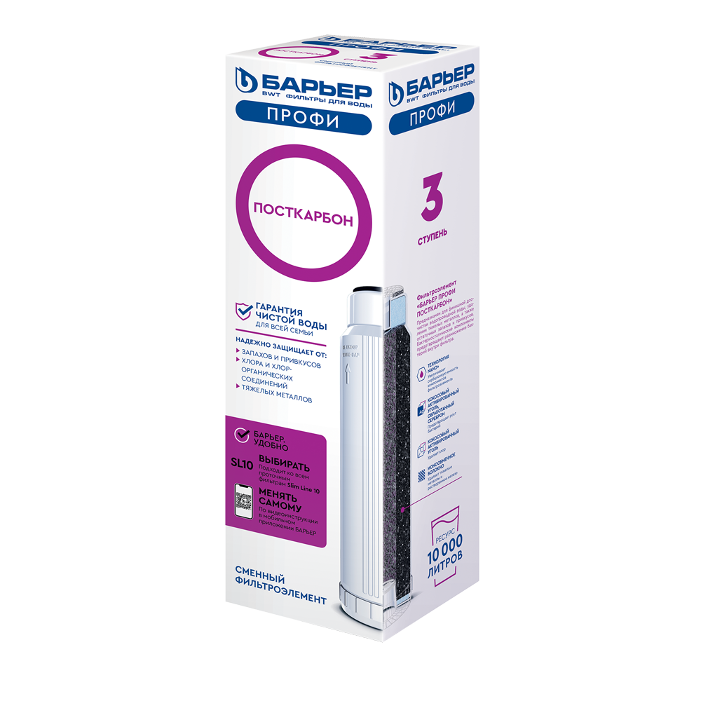 БАРЬЕР ПРОФИ Посткарбон - картридж тонкой угольной фильтрации. Устраняет неприятные привкусы, запахи, остаточные тяжелые металлы и хлор. Используется в качестве третьей ступени во всех фильтрах семейства БАРЬЕР ПРОФИ, кроме БАРЬЕР ПРОФИ Осмо.