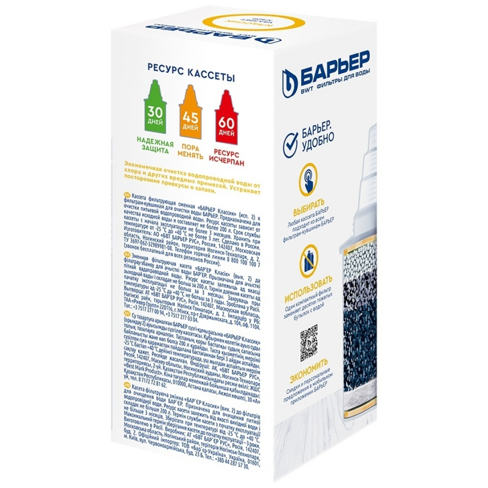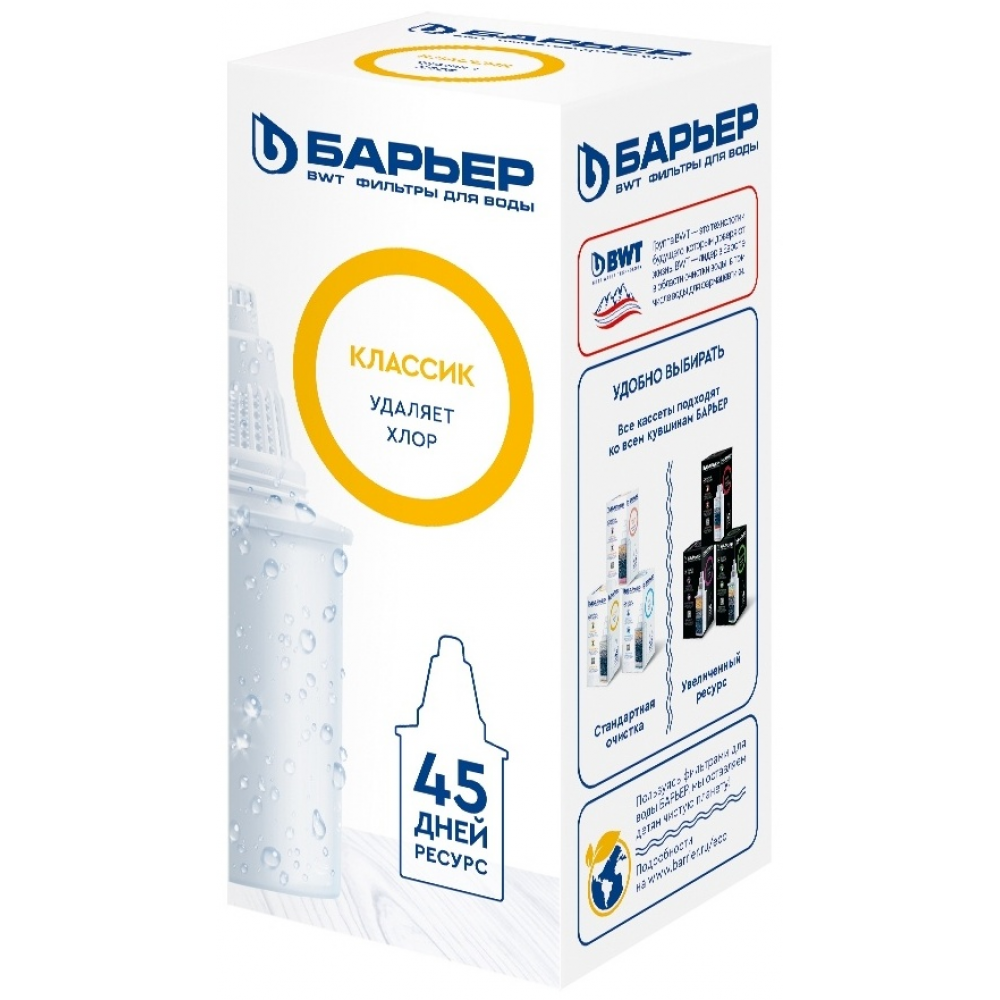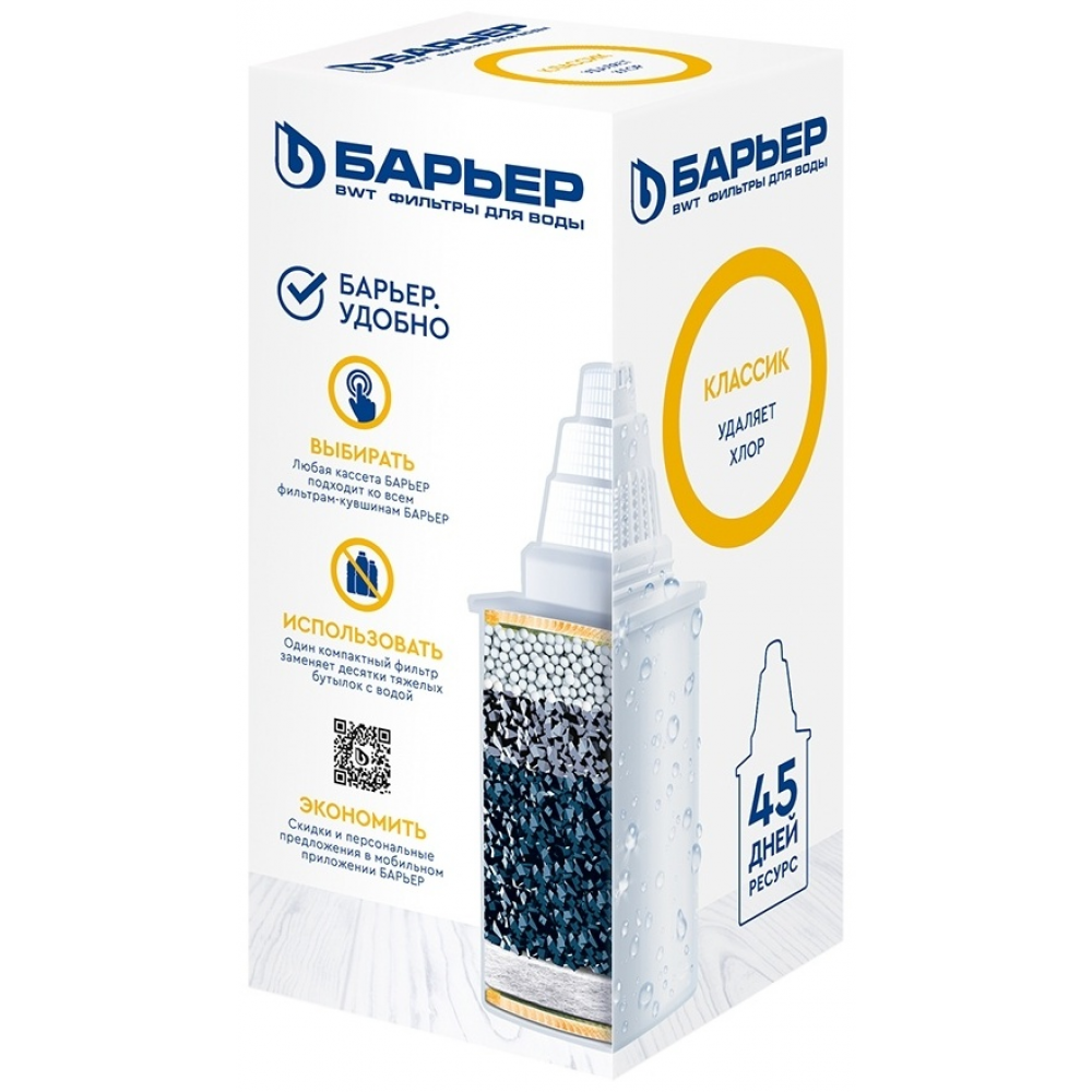 Сменная кассета БАРЬЕР Классик K011P20, размером 64×64×146 мм, предназначена для фильтров-кувшинов. Универсальная формула эффективно очищает воду от хлора, тяжёлых металлов, накипи и неприятных запахов. Ресурс — до 350 л, совместимость с фильтрами БАРЬЕР.