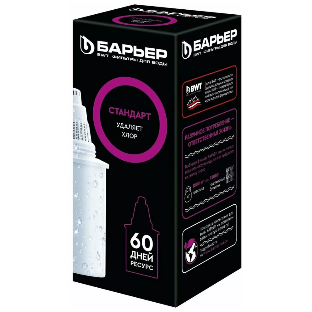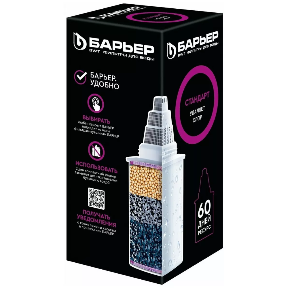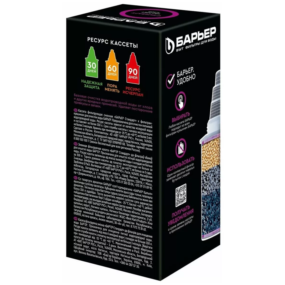 Сменная кассета БАРЬЕР Стандарт К041Р20, размером 64×64×146 мм, предназначена для фильтров-кувшинов. Универсальная формула обеспечивает базовую очистку воды от хлора, тяжёлых металлов, накипи и неприятных запахов. Ресурс — до 350 л. Совместима с фильтрами БАРЬЕР.