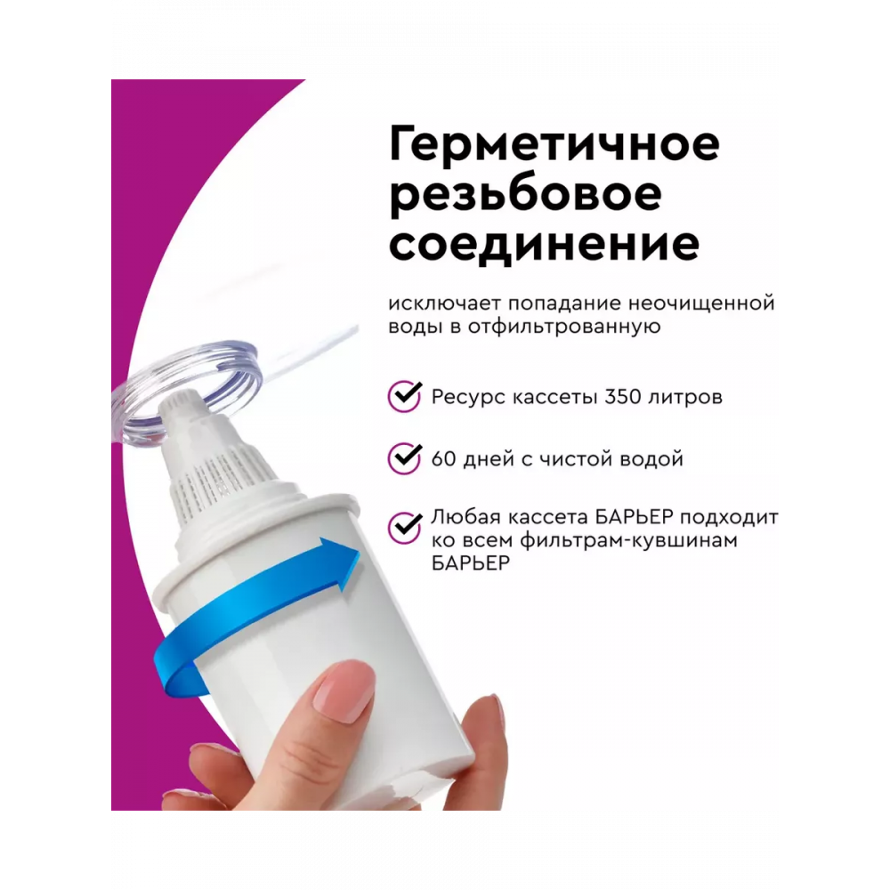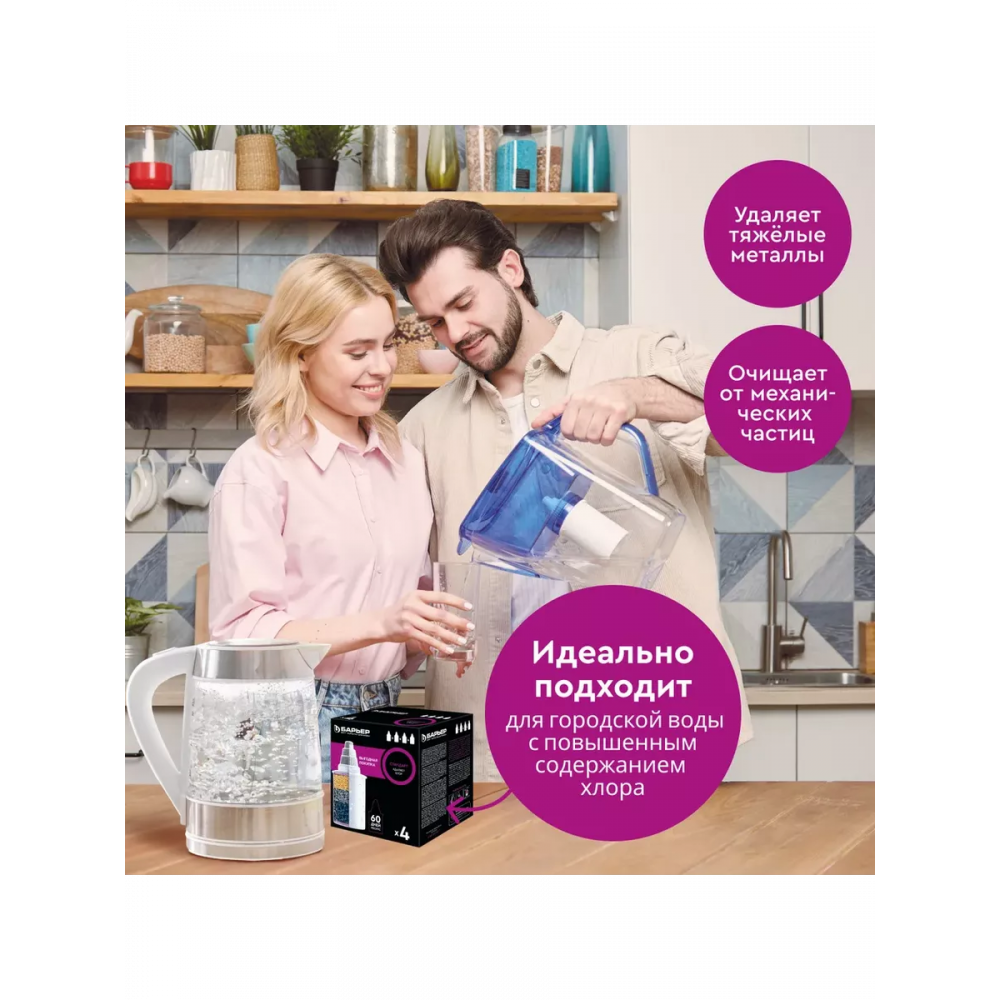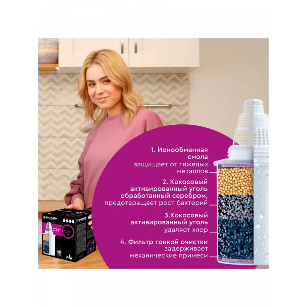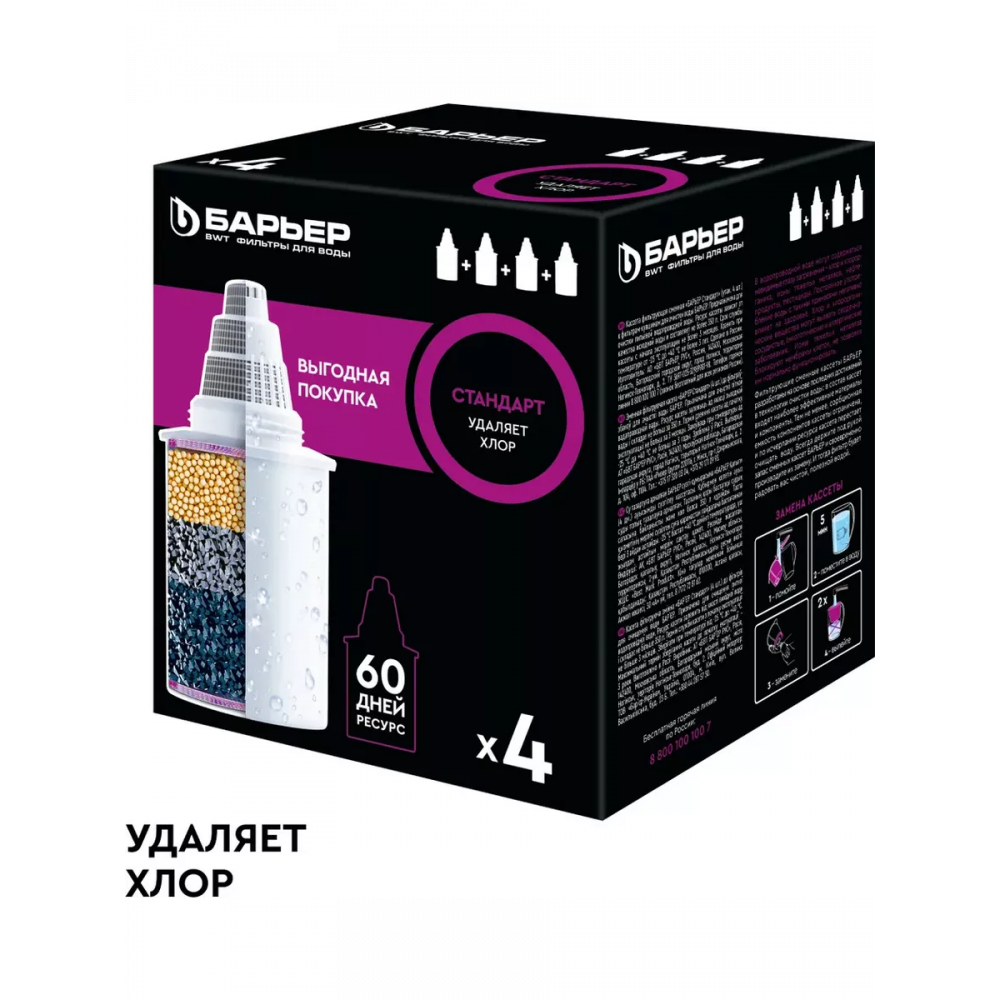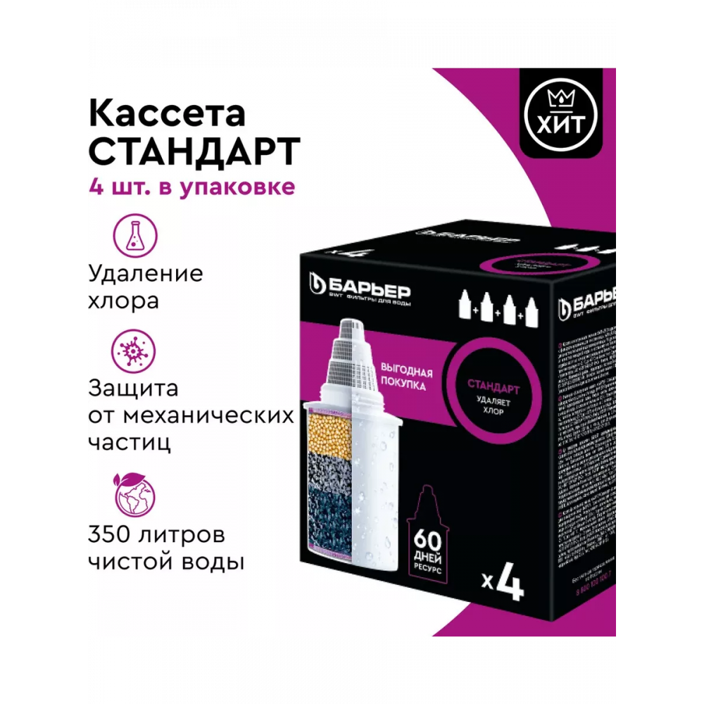 Набор из 4 сменных кассет БАРЬЕР Стандарт К144С17, каждая размером 64×64×146 мм, предназначен для фильтров-кувшинов. Универсальная формула обеспечивает базовую очистку воды от хлора, тяжёлых металлов, накипи и неприятных запахов. Ресурс каждой кассеты — до 350 л. Совместимы с фильтрами БАРЬЕР. Выгодное предложение для регулярного использования.