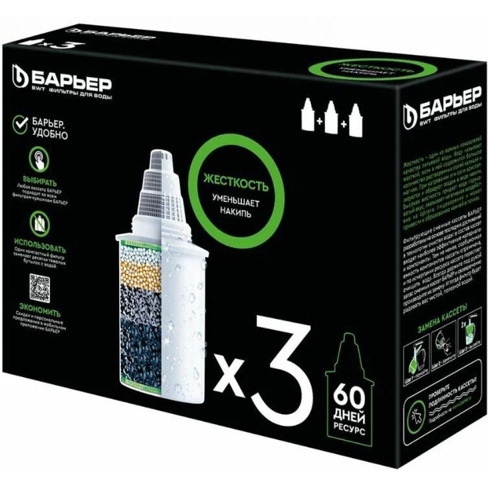 Набор из 3 сменных кассет БАРЬЕР Комплекс К303Р00, каждая размером 64×64×146 мм, предназначен для фильтров-кувшинов. Комплексная формула эффективно снижает жёсткость воды, удаляет железо, хлор, тяжёлые металлы и накипь. Ресурс каждой кассеты — до 350 л. Совместимы с фильтрами БАРЬЕР, подходят для использования в регионах с повышенным содержанием солей и железа.