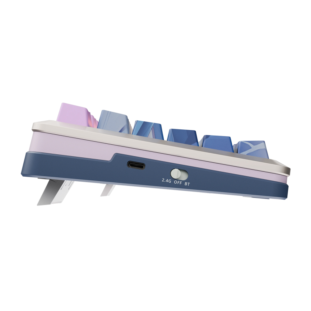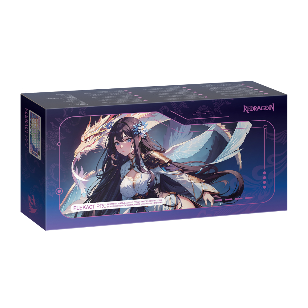 Redragon Flekact Pro (арт. 72616) - это беспроводная механическая игровая клавиатура формата 75% в фиолетово-белом цветовом исполнении. Модель выделяется наличием встроенного LCD-дисплея и поворотного регулятора (кноба) для управления настройками.
