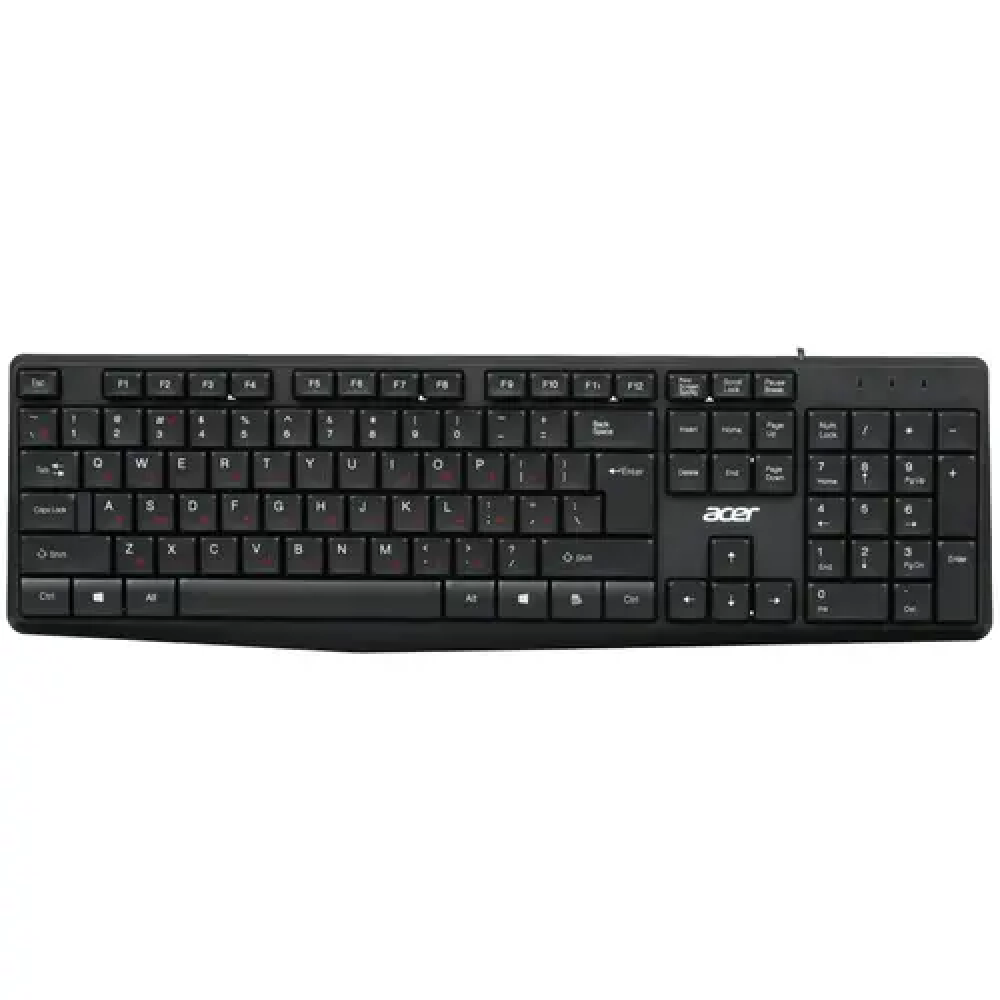 Клавиатура+мышь проводная Acer OMW141 подключается к необходимому устройству через USB-кабель. Конфигурацией клавиатуры предусмотрено 104 низкопрофильные клавиши с плоской поверхностью для уменьшения нагрузки на пальцы. Цифровой блок служит для обработки числовых данных.