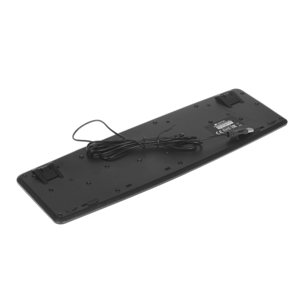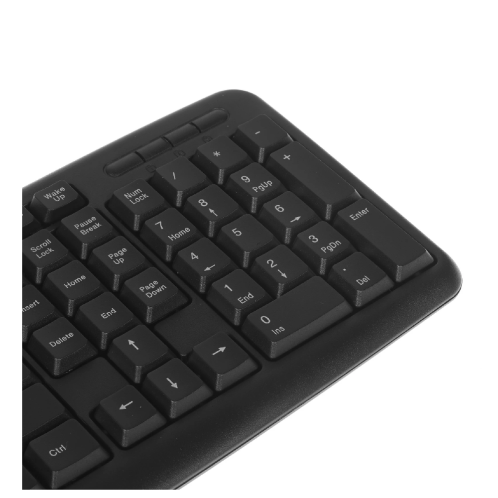 Клавиатура может «похвастаться» влагозащищенной конструкцией, поэтому чашка кофе или минералки, пролитые случайно, ей ничем не угрожают. Модель состоит из 108 клавиш с мембранным механизмом нажатия. Цифровой блок делает использование клавиатуры удобнее при работе с числами.