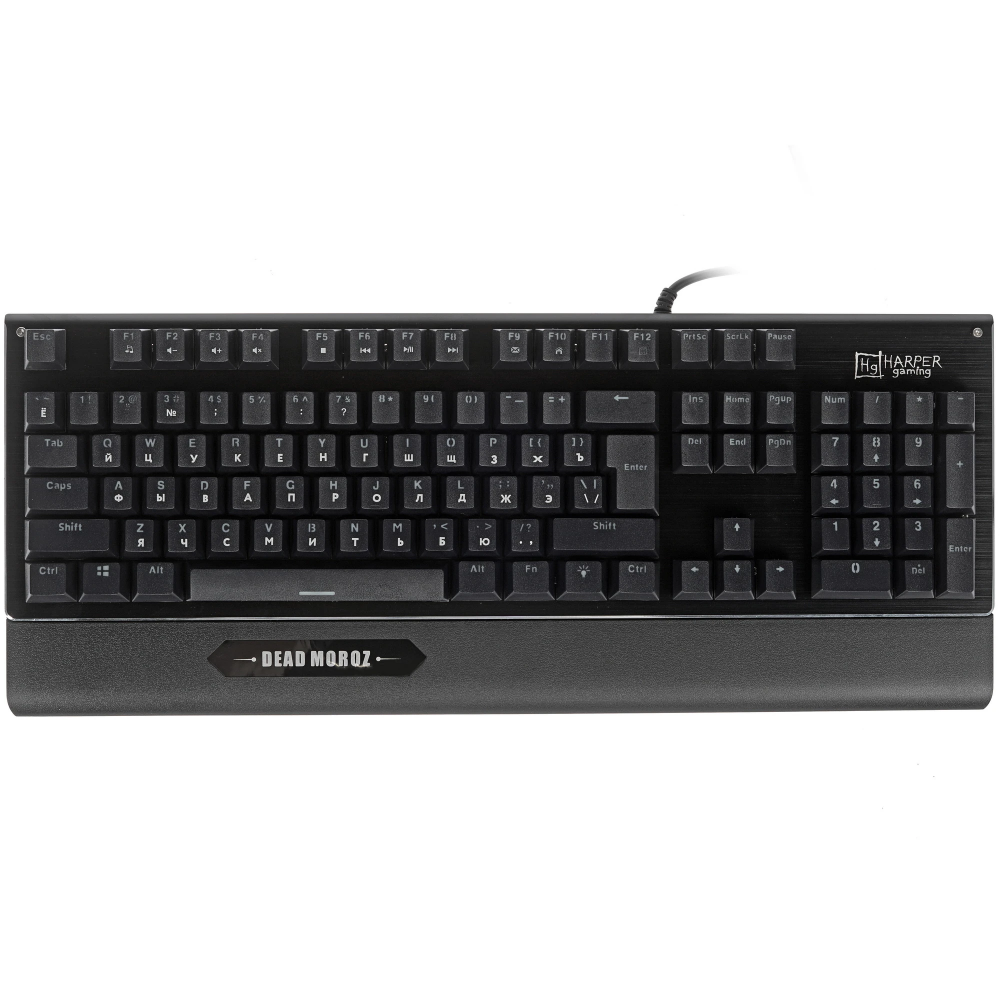Клавиатура Harper Gaming DeAd Moroz GKB-P101 механическая, она оснащена переключателями типа Blue. Всего в конструкции предусмотрено 104 клавиши, в том числе цифровой блок и специальная клавиша для ввода функций Fn. Оригинальность дизайна и комфортна работа в условиях плохой освещенности обеспечиваются встроенной многоцветной подсветкой. Вес изделия достигает 1050 г. Изготавливается Harper Gaming GKB-P101 из металла, благодаря чему она становится намного прочнее, а ее устойчивость к износам и повреждениям существенно повышается.