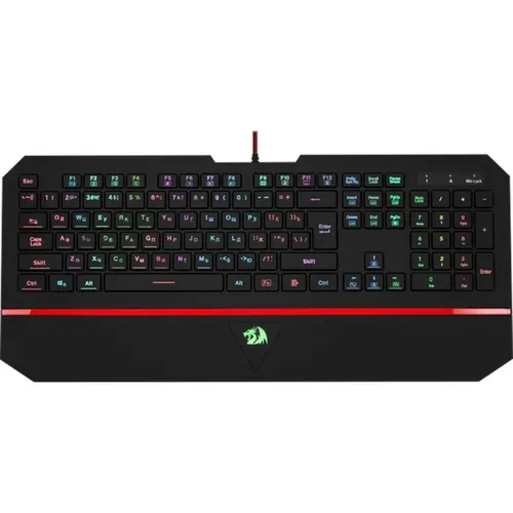 Клавиатура Redragon Karura 2 черного цвета с красными вставками обладает уникальной конструкцией и RGB-подсветкой клавиш. Это позволит превратить игру в более увлекательное и динамичное действо. Подставка для рук обеспечивает комфорт во время длительной игры. Мембранные клавиши отличаются тихим и плавным ходом, а чтобы исключить неправильные действия, предусмотрено анти-фантомное нажатие до 19 клавиш одновременно и блокировка клавиши Windows.