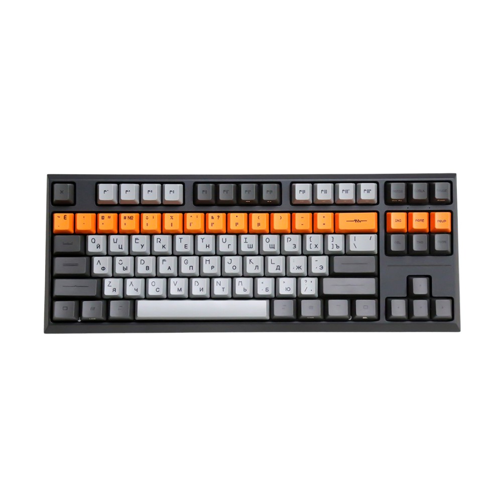 Клавиатура Varmilo имеет не только оригинальный дизайн: колпачки изготовлены из высокопрочного пластика PBT с применением dye-sublimation технологии с выгравированными символами на боках, использование dye-sub позволяет символам никогда не стереться и никак не чувствоваться при печати, а качественный PBT пластик гарантирует надежность и долговечность, клавиши имеют слегка текстурированный верх и приятны на ощупь.