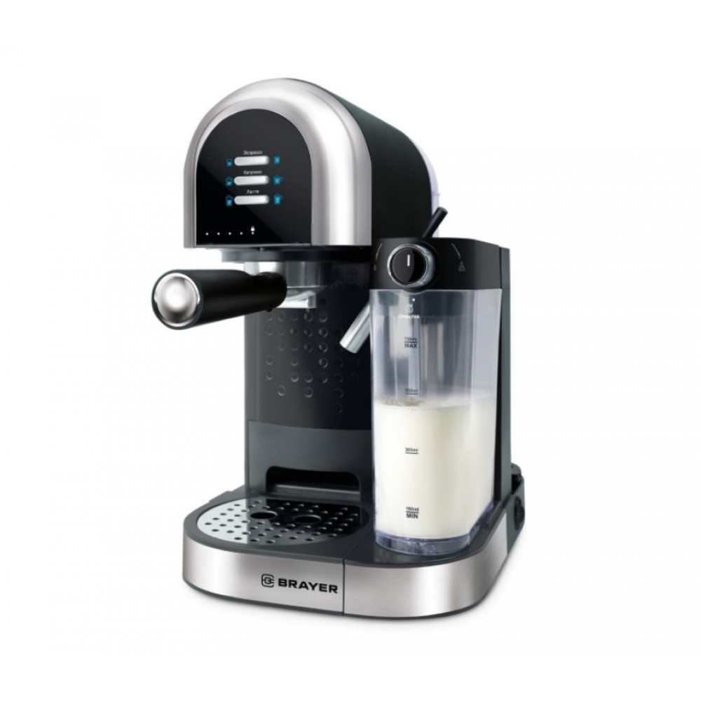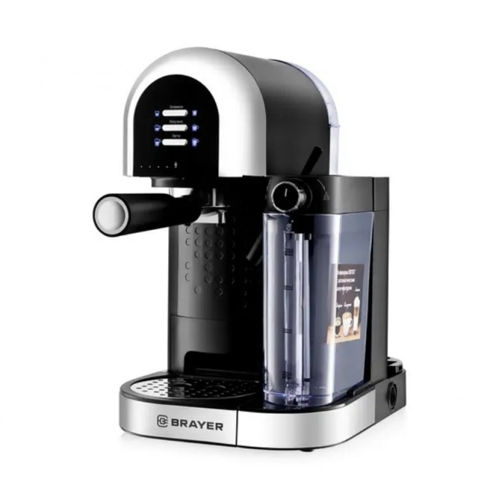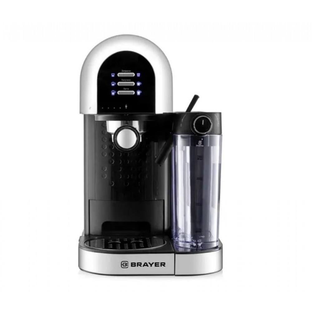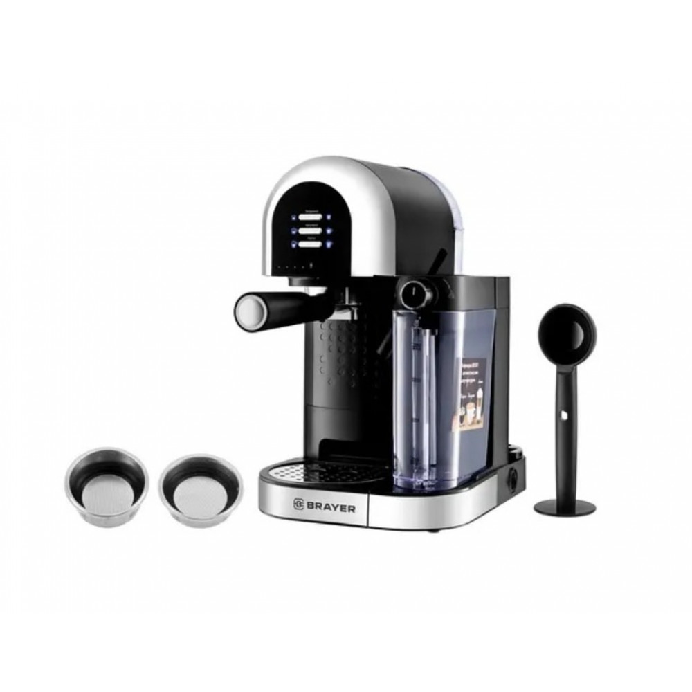 Кофеварка BRAYER BR1107 выполнена в элегантном сочетании чёрного и серебристого цветов и предназначена для приготовления кофе с использованием молотого сырья. Модель относится к рожковым кофеваркам и оснащена металлическим рожком, что обеспечивает долговечность и равномерное приготовление напитка.