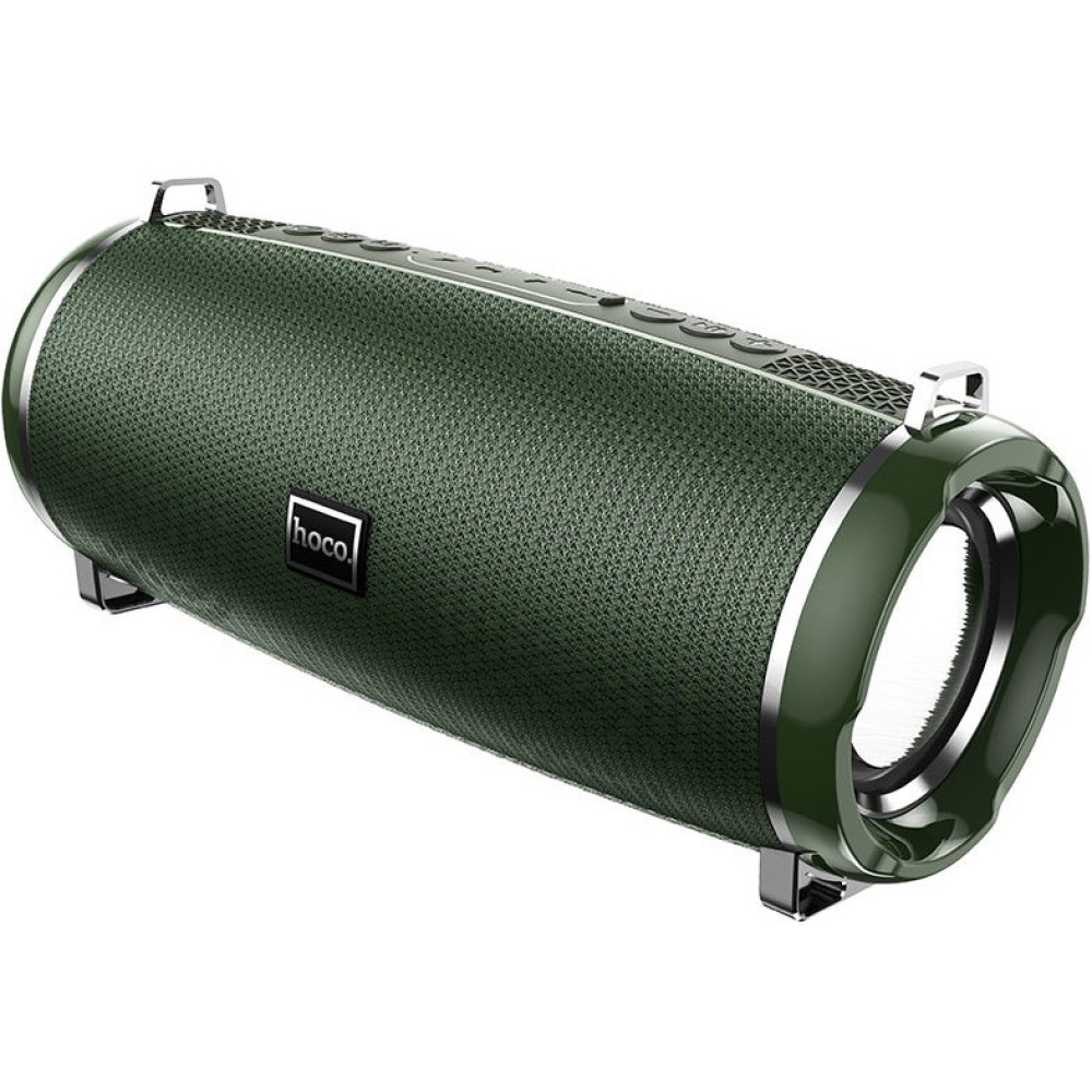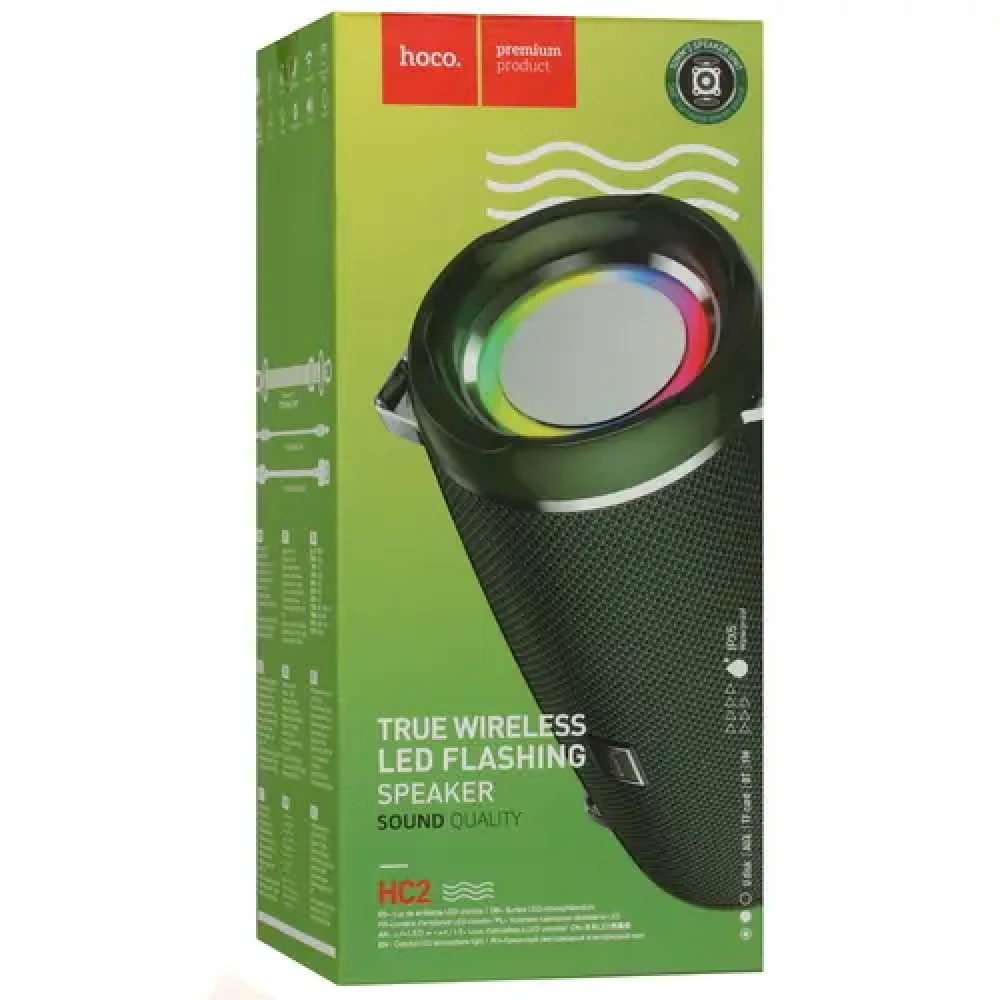 Портативная колонка HOCO HC2 выполнена в прочном защищенном корпусе по стандарту IPX5, что позволяет прослушивать музыку дома или на улице в различных погодных условиях. Для подключения к источникам звука предлагаются беспроводной интерфейс Bluetooh, порт USB, разъем аудио AUX, считыватель карты памяти MicroSD. Из функциональных особенностей отмечаются FM-радио и возможность ответа на входящие звонки. Полного заряда аккумулятора достаточно для 6 часов автономной работы аудиосистемы. В комплекте с HOCO HC2 поставляются переносной плечевой ремень, аудиокабель и кабель питания.