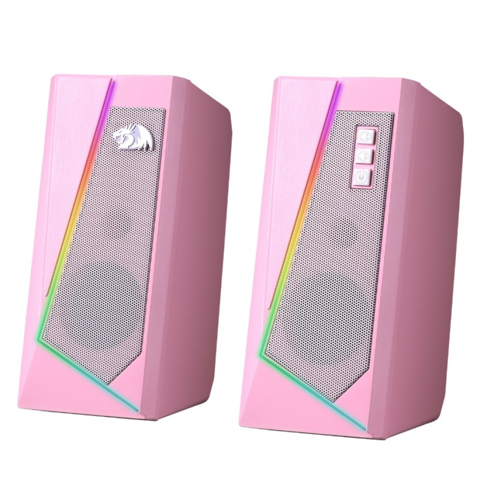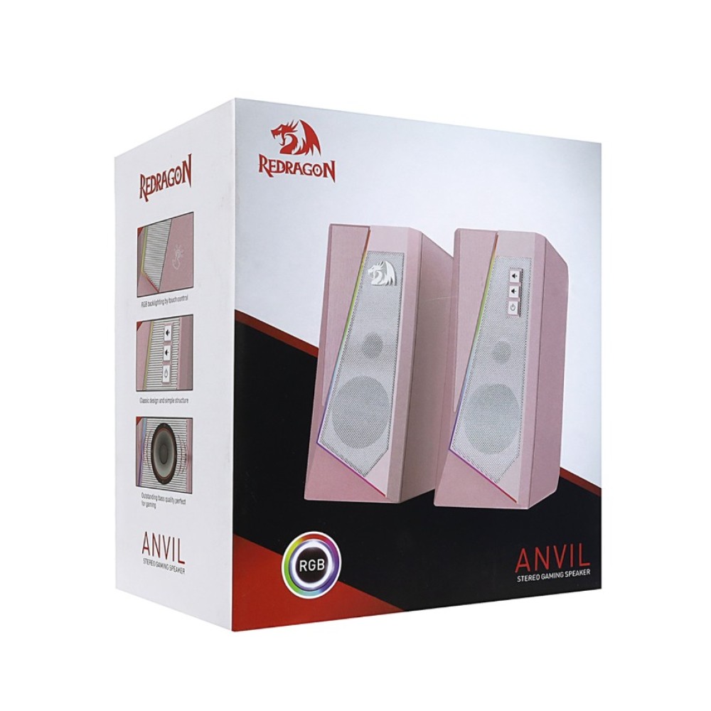 Redragon Anvil - стильная акустическая система с безупречным звуком и переливающейся светодиодной подсветкой. На верхней панели сателлита присутствует сенсорная поверхность для включения\отключения подсветки. На фронтальной панели кнопки для регулировки громкости и включения\отключения питания.