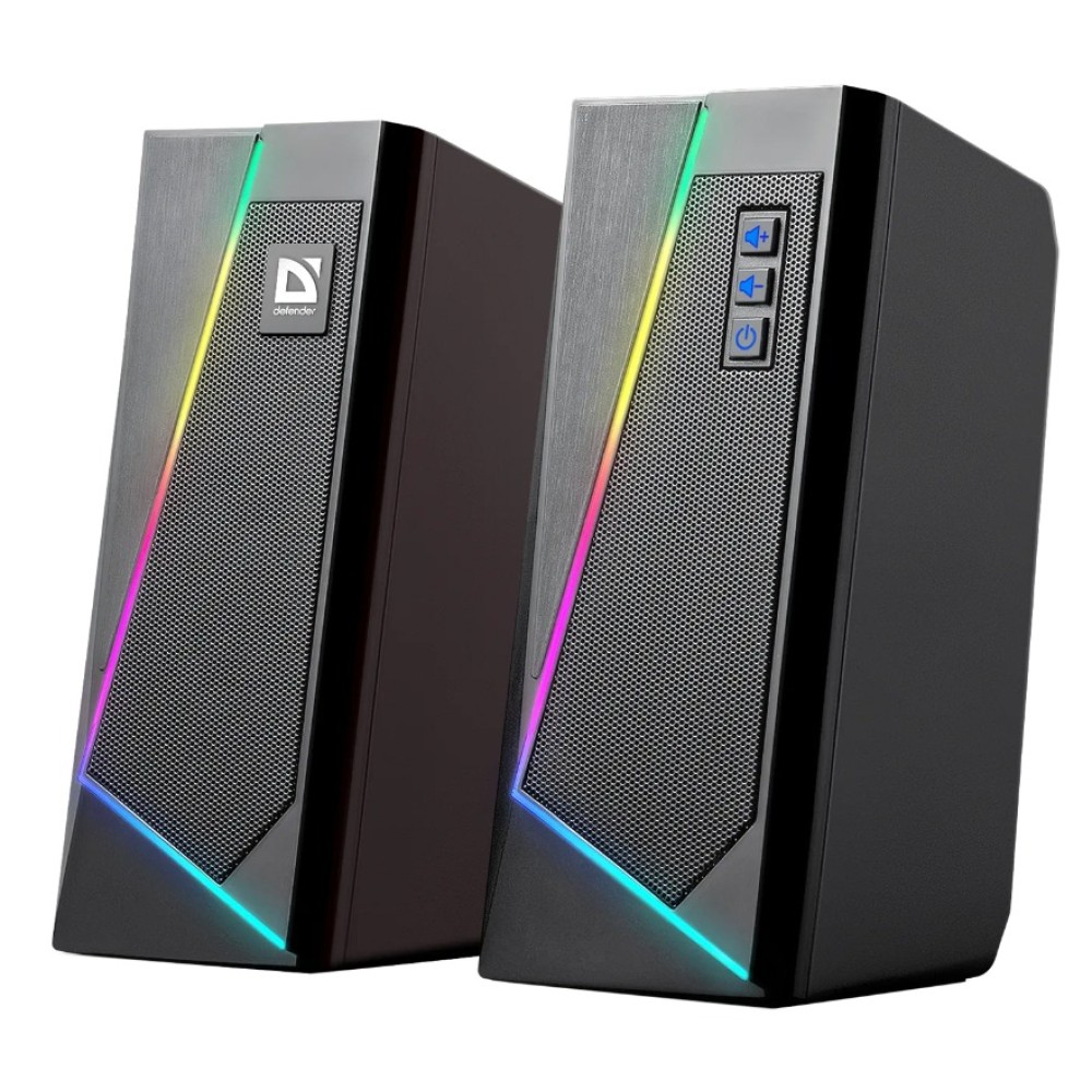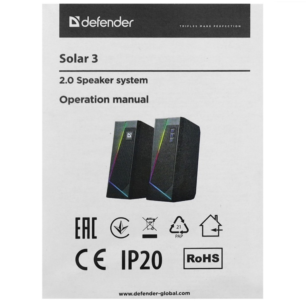 Акустическая система Defender Solar 3 (2.0) с функцией Bluetooth и отключаемой светодиодной подсветкой. Сенсорная поверхность для переключения режимов подсветки. Кнопки управления громкостью, переключения режимов AUX/Bluetooth и включения/отключения питания удобно расположены на фронтальной панели.