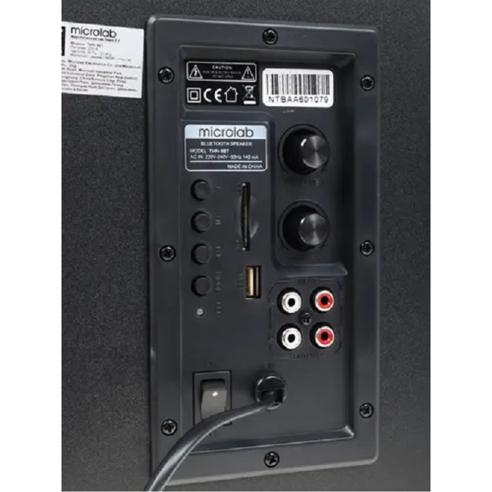 Microlab TMN9BT поддерживает независимое воспроизведение благодаря наличию слота для установки карт SD, с которых можно воспроизводить треклист, который вам нравится. Корпус колонок изготовлен из МДФ, благодаря чему достигается высокое качество звука. Акустическая система предусматривает наличие динамиков высоких частот без возможности регулировки, а также динамиков низких частот, которые поддерживают настройку. С правой стороны сабвуфера расположены два регулятора, при помощи которых вы сможете настраивать уровень низких частот и громкость звучания системы.