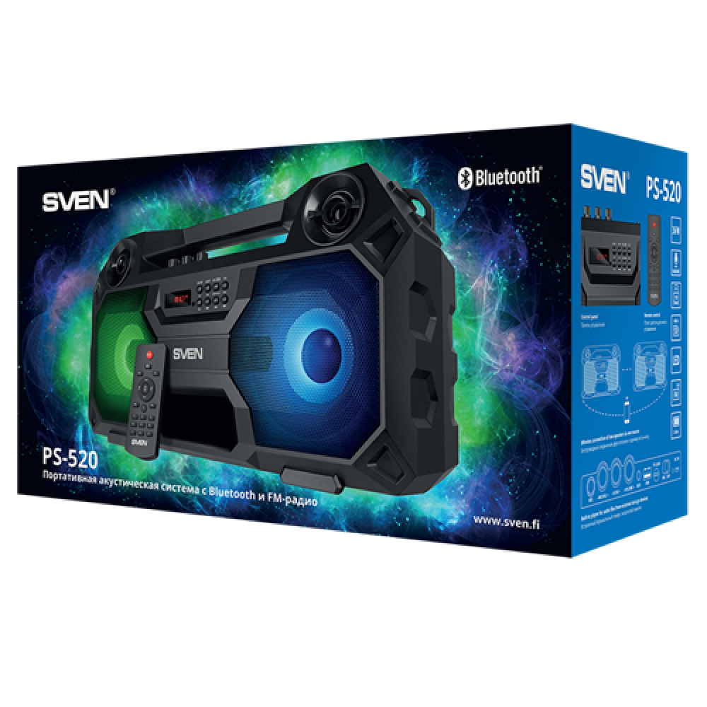 Акустическая система обладает сбалансированным звуком с ярко выраженным басом, который особенно актуален в танцевальных композициях. Изменить тональный баланс на свой вкус поможет встроенный эквалайзер. Ну а на случай, если вам вдруг не хватит громкости или объема, захочется создать глубокий стереоэффект и расширить границы своей вечеринки, поддерживается Bluetooth-подключение сразу двух SVEN PS-520 к одному источнику. Есть и проводное соединение, гаджеты без поддержки Bluetooth также можно использовать в качестве плеера.