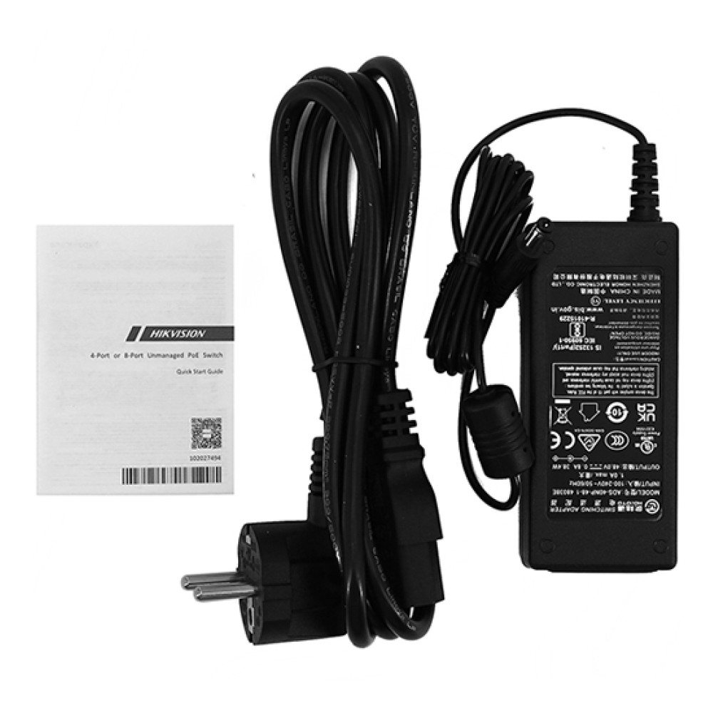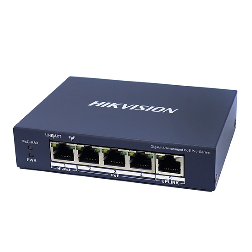 Коммутатор Hikvision DS-3E0505HP-E обладает металлическим корпусом, надежно защищающим модель от повреждений. Компактные размеры устройства позволяют легко размещать его прямо у вас на рабочем столе. Подключение оборудования может производиться при помощи 5 сетевых портов с высокой пропускной способностью, из которых 4 поддерживают питание по технологии PoE. С помощью светодиодных индикаторов, расположенных на лицевой панели, вы сможете удобно отслеживать состояние сети и работу оборудования. Комплектация коммутатора включает в себя адаптер и кабель питания.