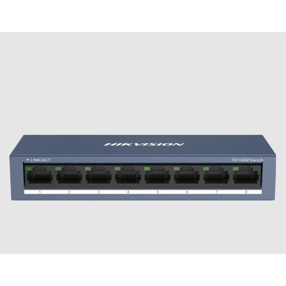Коммутатор Hikvision DS-3E0508-E(B) выполнен в компактном и прочном металлическом корпусе с безвентиляторным охлаждением. Благодаря своим размерам модель может легко размещаться прямо на рабочем столе, обеспечивая быстрый доступ к портам. Кроме того, модель оснащена светодиодными индикаторами на лицевой панели, с помощью которых вы сможете наглядно следить за состоянием работы устройства. В качестве источника питания коммутатор использует сеть 220 В. Для подключения к ней в комплекте предусмотрен адаптер питания.