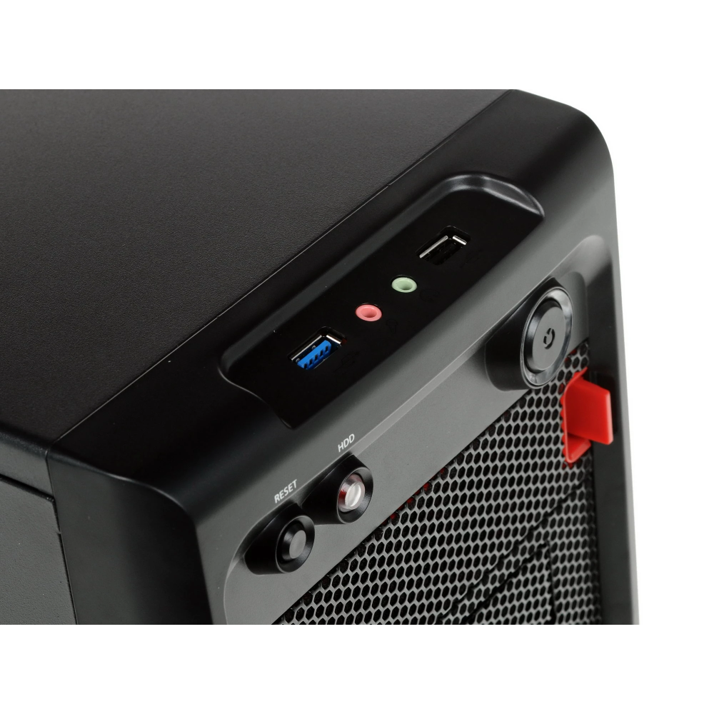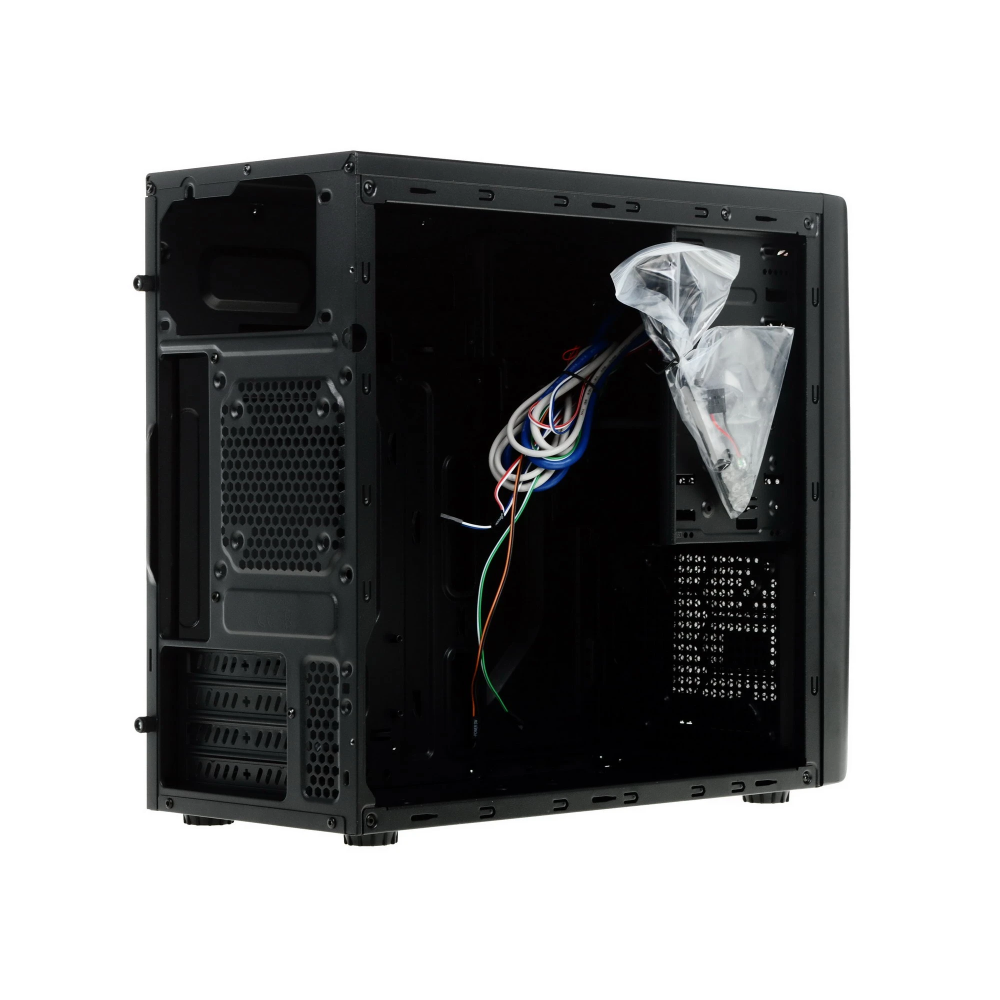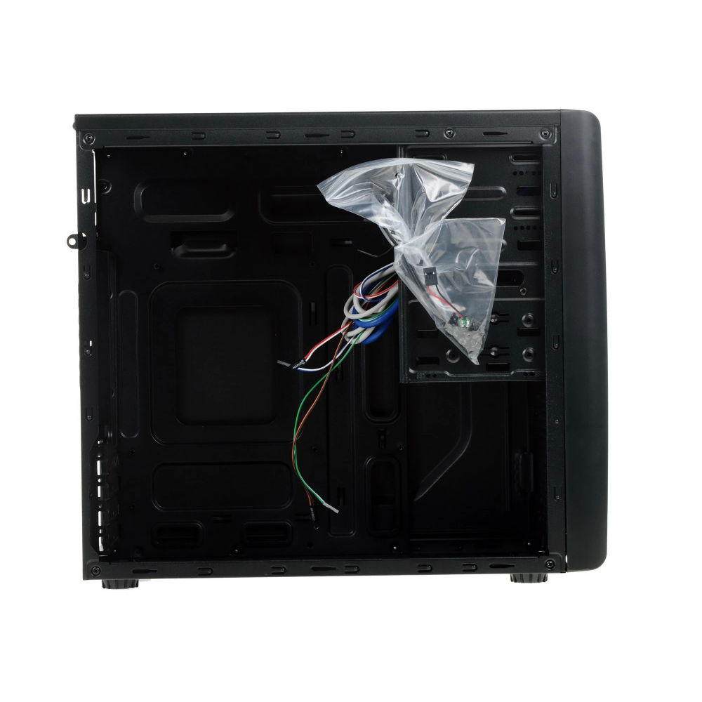 Блок питания с горизонтальной ориентацией расположен в верхней части корпуса. Благодаря габаритам данной модели, в этот корпус можно вместить карту размером 320 мм и довольно большой кулер – 166х166 мм. Внутреннее охлаждение создано так, чтобы можно было разместить до 3-х вентиляторов одновременно и предотвратить перегрев системы даже во время пиковых нагрузок. На фронтальной части расположен индикатор HDD, разъем для аудиоустройств и два входа USB: 3.0 и 2.0. Для удобства есть специальное отделение для прокладки кабелей за задней стенкой и набор крепежных винтов в комплекте.