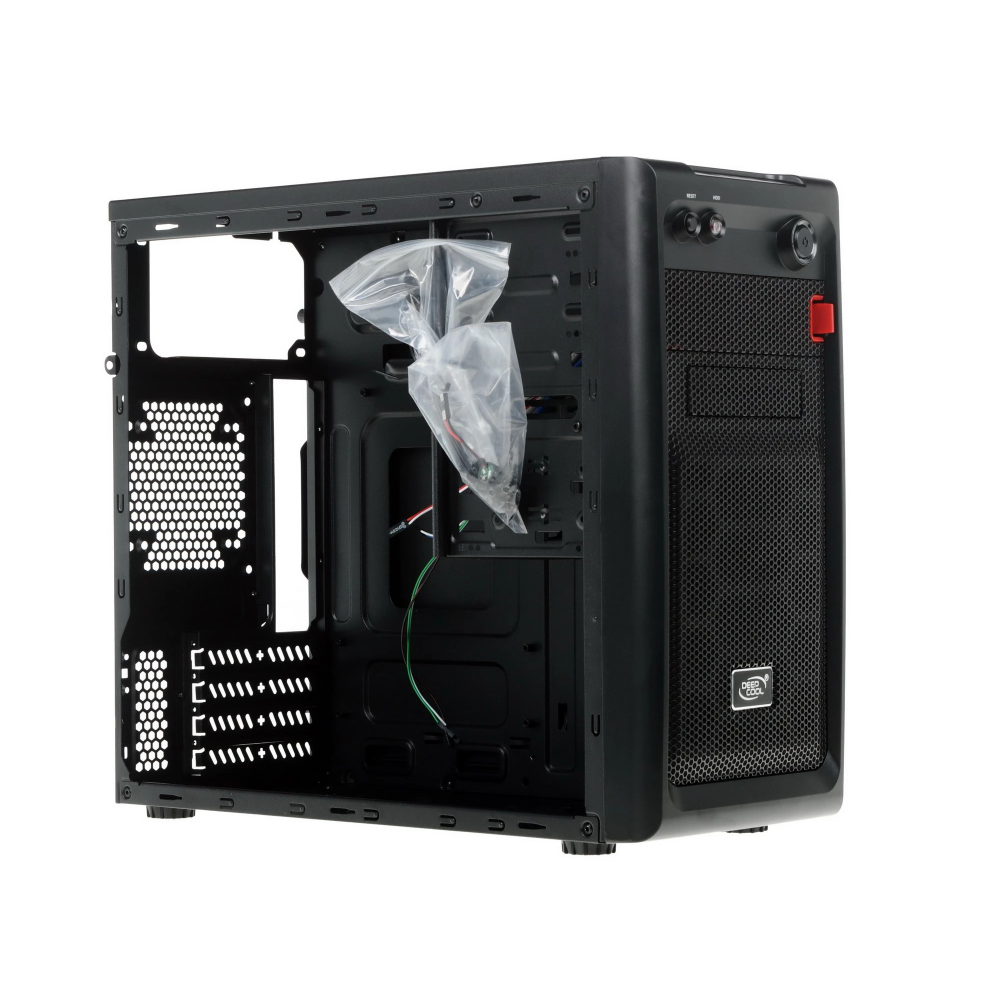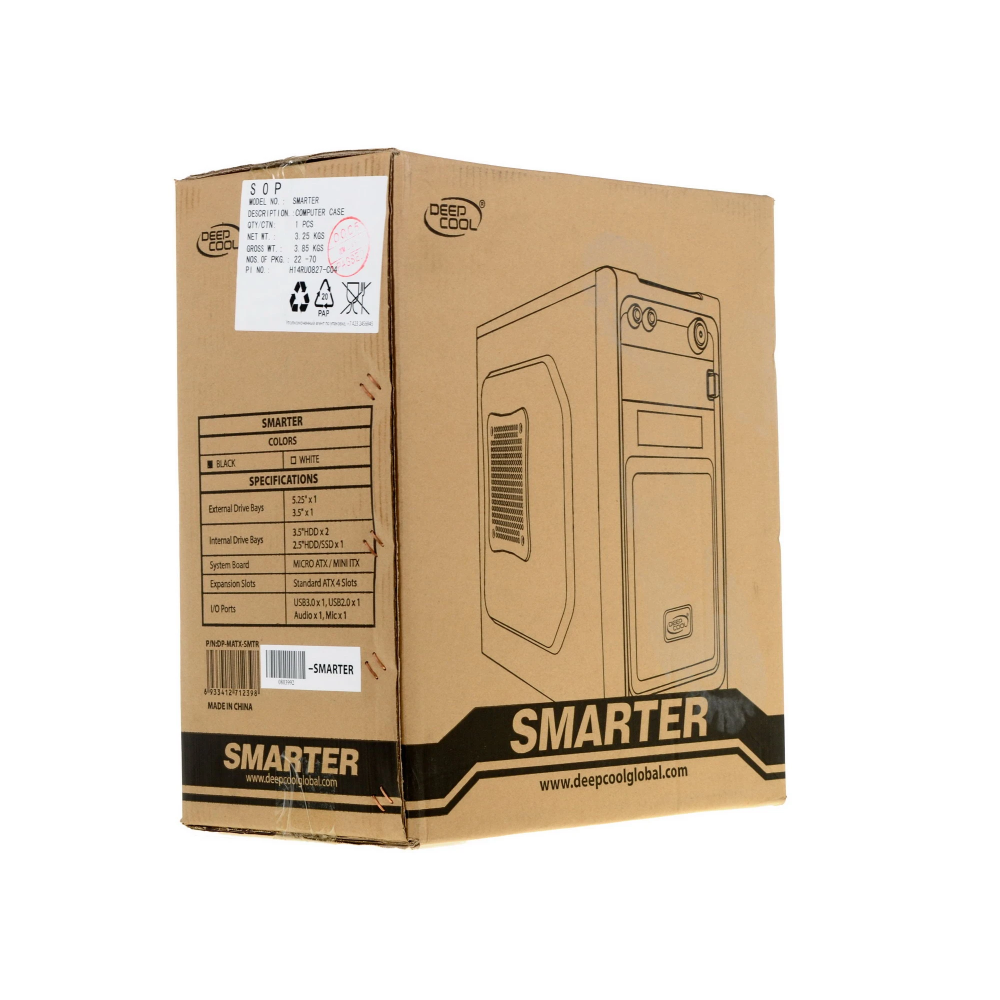 Корпус Micro ATX Deepcool Smarter с типоразмером Mini-Tower изготовлен из стали и пластика в классическом черном цвете и украшен сеткой на передней панели. Такой внешний вид впишется в строгую обстановку офисных помещений. Micro ATX Deepcool Smarter имеет следующие параметры: длина 420 мм, ширина 201 мм, высота 365 мм, вес составляет 3,4 кг.