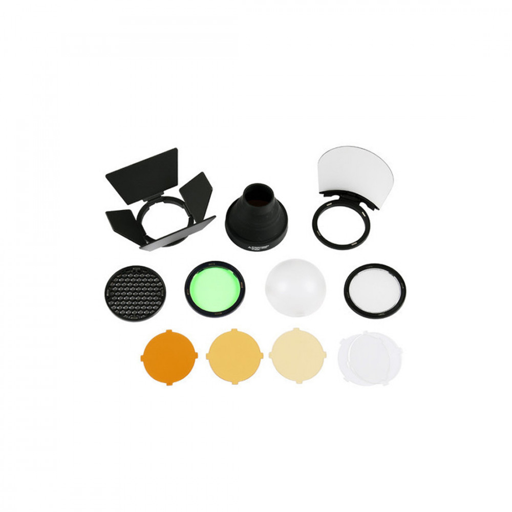 Комплект насадок Godox AK-R1 предназначен для моделей вспышек Godox Witstro V1, AD180, AD360II, AD200, AD200 Pro и RGB мини-светильника R1. Включает разнообразные насадки для изменения формы и качества света — софтбоксы, рефлекторы, цветные фильтры и другие аксессуары. Позволяет быстро адаптировать свет под разные задачи в фотографии и видеосъемке