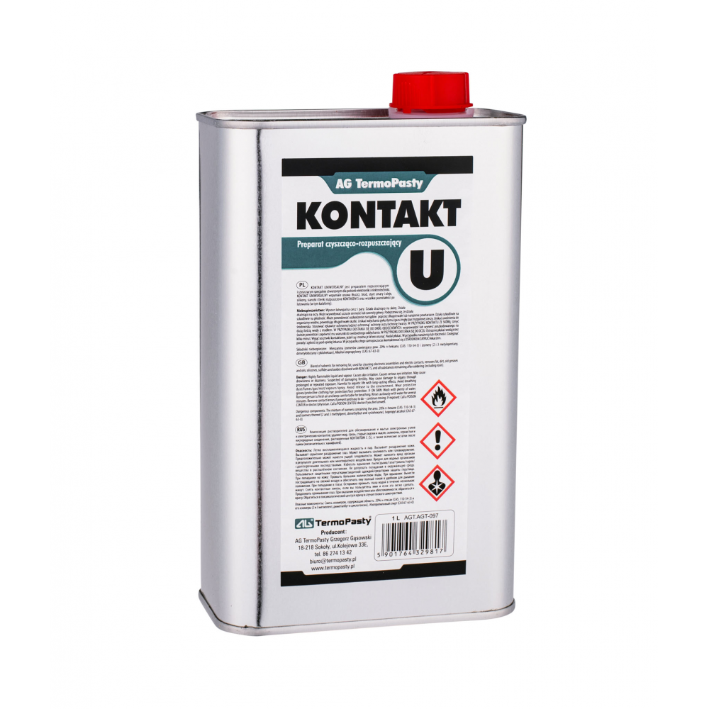 Kontakt U AG TermoPasty AGT-097 (1 л, металлическая канистра) — композиция растворителей, предназначенная для промышленного уровня очистки и обезжиривания электронных узлов и электрических контактов. Средство эффективно удаляет жир, грязь, старые смазки и масла, силиконы, сернистые и кислородные соединения, ранее растворённые средством Kontakt S, а также остатки после пайки, включая канифоль. Обеспечивает чистоту, восстанавливает нормальную проводимость, защищает контакты от коррозии и уменьшает переходное сопротивление.