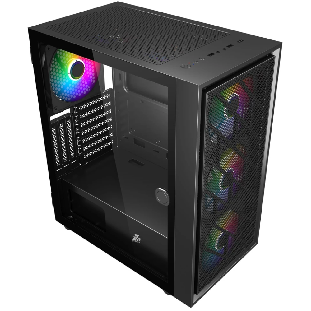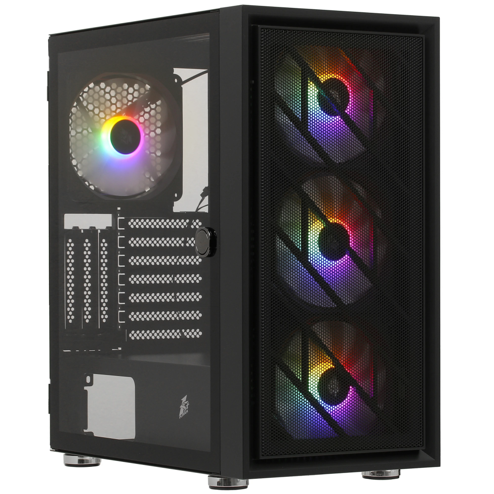 Корпус 1STPLAYER AR-7 (AR-7-4G6P) форм-фактора Mid-Tower создан для того, чтобы стать основой мощной системы. Собрать ее вы сможете на свое усмотрение. Внутри получится расположить материнскую плату типов Micro-ATX, Mini-ITX, Standard-ATX, видеокарту длиной 34 см, а также блок питания ATX. Кабели внутри прокладываются за задней стенкой для рационального использования пространства. Боковые панели открываются как дверцы для удобства доступа к внутренним компонентам. Основой корпуса 1STPLAYER AR-7 (AR-7-4G6P) являются пластик, сталь и стекло. Через лицевую панель, выполненную из металлической сетки, видно 3 кулера с подсветкой.