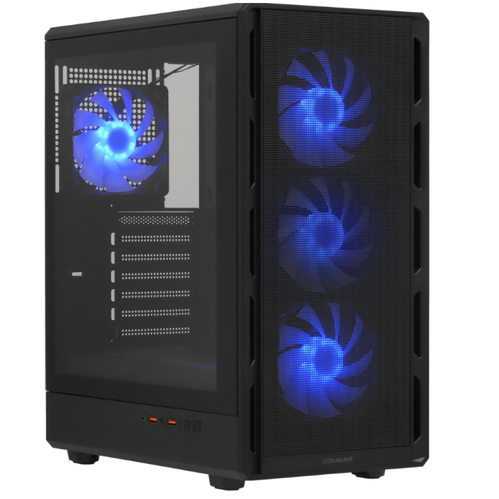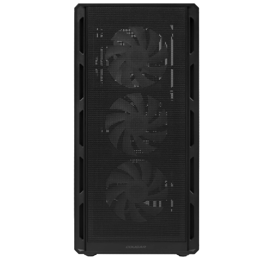 Корпус Cougar Airface Pure Pro Black с прозрачной передней и боковой панелью открывает панорамный обзор на элементы ПК. Пылевой фильтр и металлическая сетка гарантируют исправную работу системы охлаждения. Прокладка кабелей за задней стенкой сохраняет порядок внутреннего пространства. Есть программируемая ARGB-подсветка установленных вентиляторов.