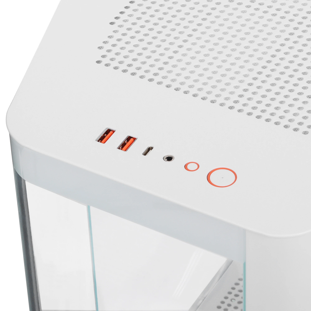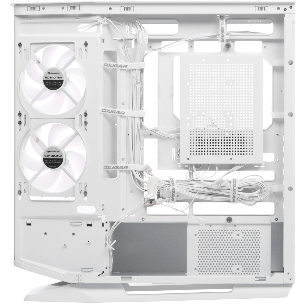 Корпус Cougar FV270 RGB White [CGR-58M6W-RGB] белого цвета с исполнением «аквариум» ориентирован на сборку мощного игрового компьютера. Фронтальная и боковая панели из закаленного стекла обеспечивают панорамный обзор компонентов ПК и многоцветной подсветки с возможностью одновременного отображения нескольких цветов. Для управления световыми эффектами используются специальная кнопка и комплектный контроллер. В модели реализованы быстросъемные фильтры для защиты от пыли и дополнительный воздухозаборник под передней частью. Прокладка кабелей за задней стенкой повышает эффективность вентиляции и улучшает внешнюю привлекательность системы. Фиксация боковых панелей защелками упрощает модернизацию компьютера.