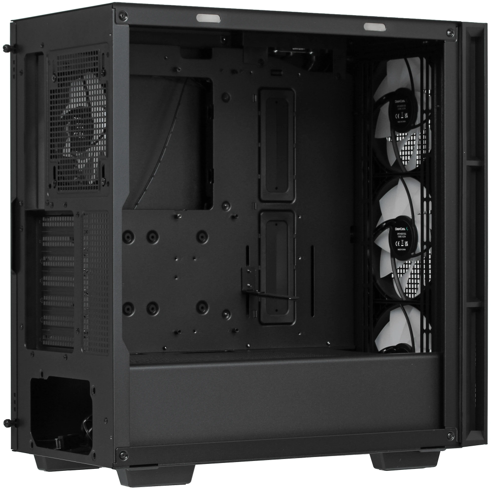 DEEPCOOL CH560 (R-CH560-BKAPE4-G-1) относится к среднеразмерному типу Mid-Tower. Его боковые панели фиксируются на магниты. Внутри предусмотрены пылевой фильтр и фиксаторы для прокладывания кабелей вдоль стенок.